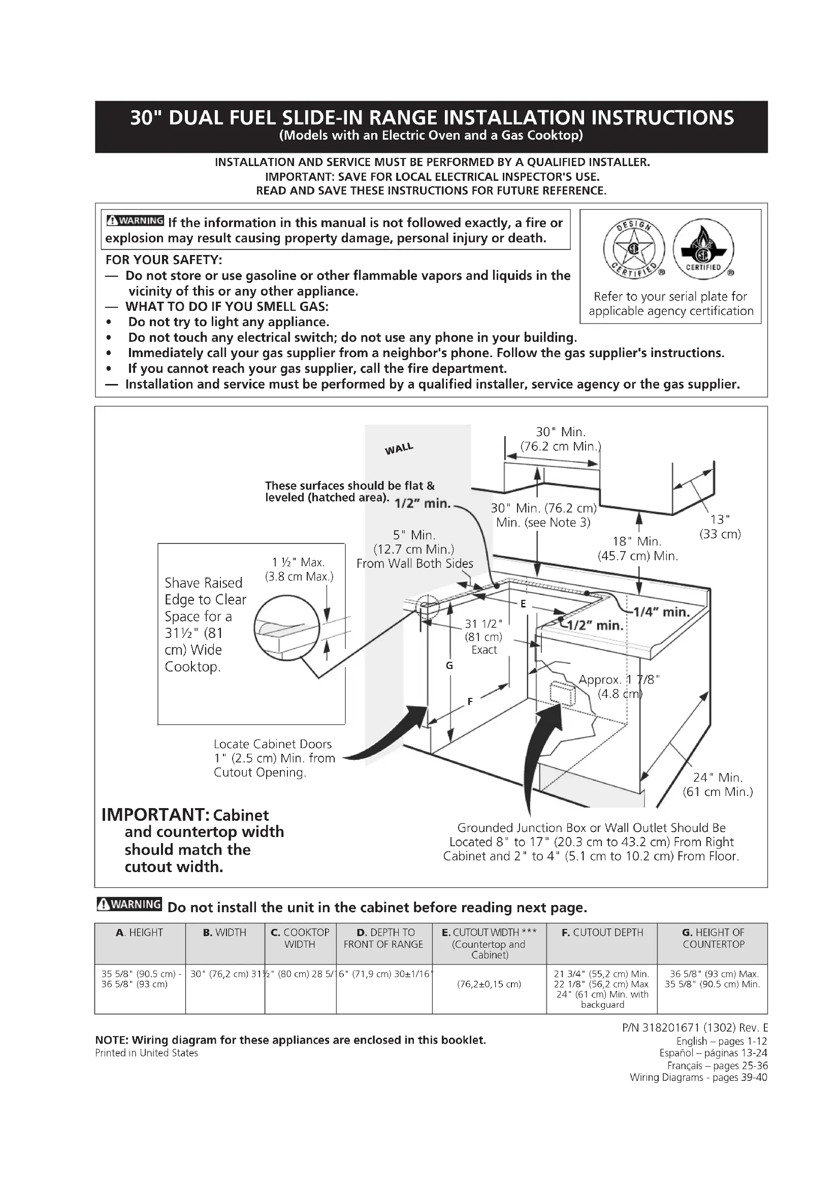 - Ifyoucannotreachyourgassupplier,calltheredepartment. — Installation and service must be performed by a qualified installer, service agency or the gas supplier. INSTALLATION AND SERVICE MUST BE PERFORMED BY A QUALIFIED INSTALLER.IMPORTANT:SAVEFORLOCALELECTRICALINSPECTOR'SUSE.READ AND SAVE THESE INSTRUCTIONS FOR FUTURE REFERENCE.NOTE: Wiring diagram for these appliances are enclosed in this booklet.Printed in United States Refer to your serial plate for applicable agency certification WALL 5" Min. (12.7 cm Min.) From Wall Both Sides 30" Min. (76.2 cm Min.) 30" Min. (76.2 cm) Min. (see Note 3) 18" Min. (45.7 cm) Min. Approx. 1 7/8" (4.8 cm) Grounded Junction Box or Wall Outlet Should Be Located 8" to 17" (20.3 cm to 43.2 cm) From Right Cabinet and 2" to 4" (5.1 cm to 10.2 cm) From Floor. Locate Cabinet Doors 1" (2.5 cm) Min. from Cutout Opening.