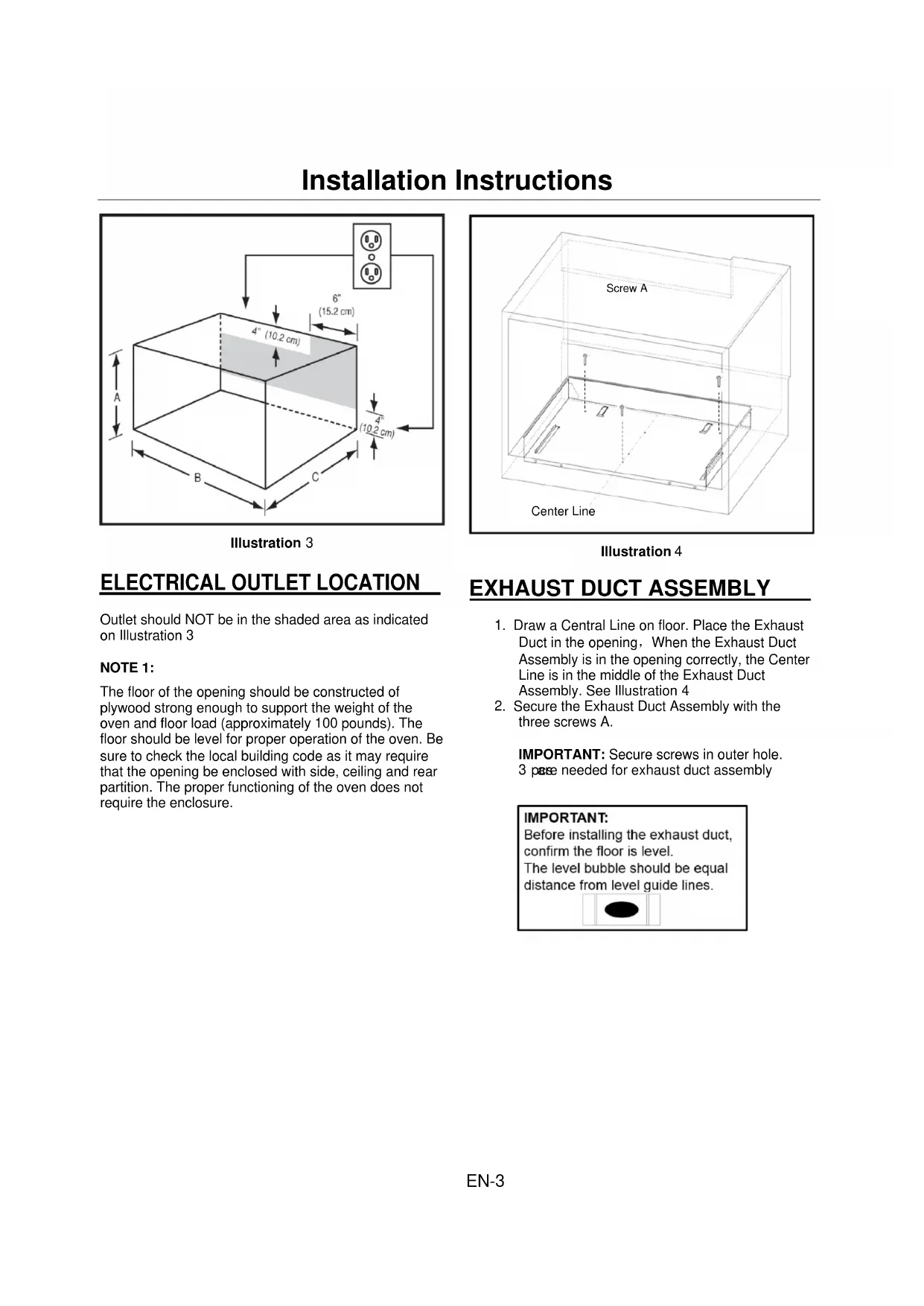Outlet should NOT be in the shaded area as indicated on Illustration 3 NOTE 1: The floor of the opening should be constructed of plywood strong enough to support the weight of the oven and floor load (approximately 100 pounds). The floor should be level for proper operation of the oven. Be sure to check the local building code as it may require that the opening be enclosed with side, ceiling and rear partition. The proper functioning of the oven does not require the enclosure.
