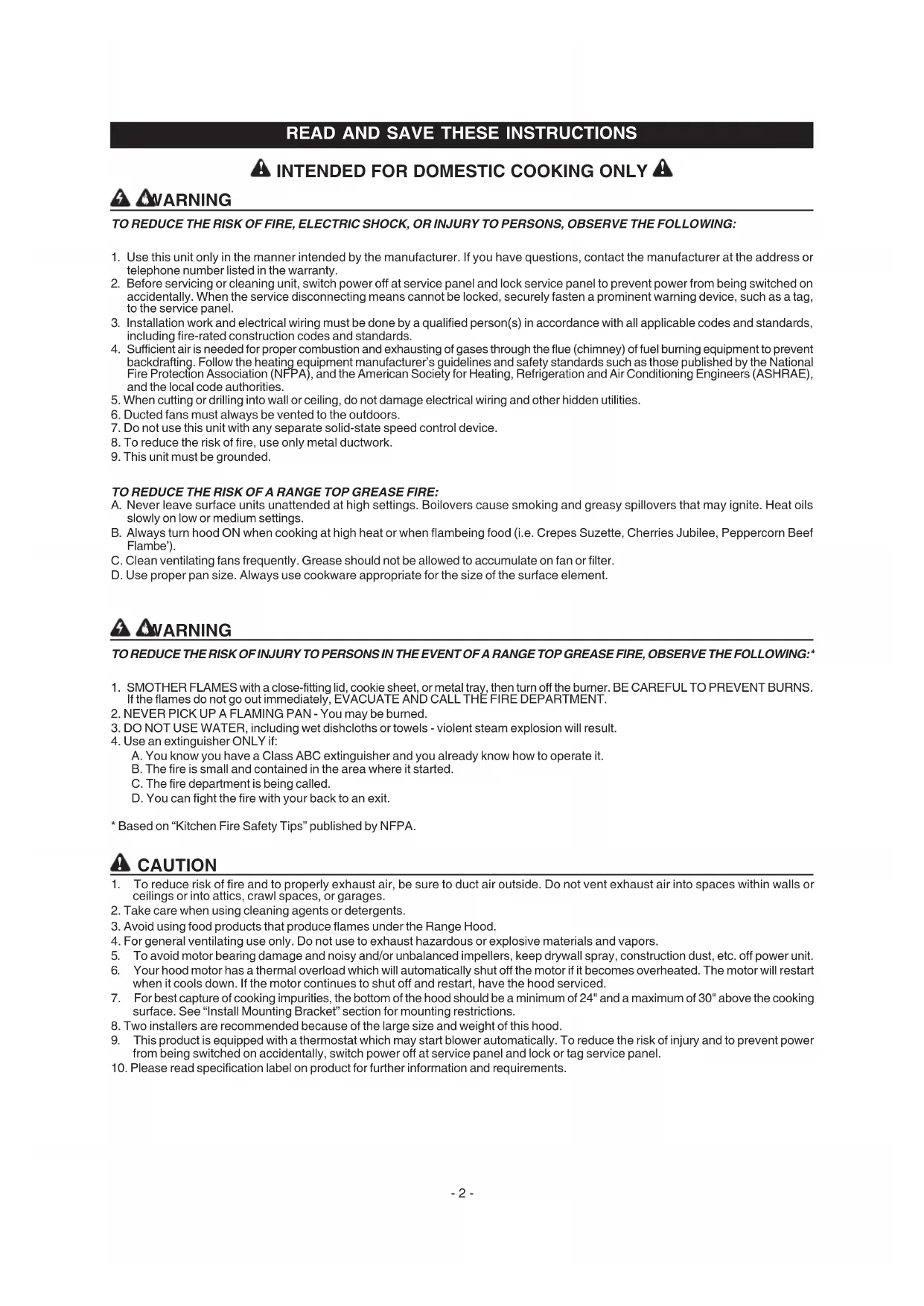 TO REDUCE THE RISK OF A RANGE TOP GREASE FIRE: A. Never leave surface units unattended at high settings. Boilovers cause smoking and greasy spillovers that may ignite. Heat oils slowly on low or medium settings. B. Always turn hood ON when cooking at high heat or when flambeing food (i.e. Crepes Suzette, Cherries Jubilee, Peppercorn Beef Flambe’). C. Clean ventilating fans frequently. Grease should not be allowed to accumulate on fan or filter. D. Use proper pan size. Always use cookware appropriate for the size of the surface element. WARNING TO REDUCE THE RISK OF INJURY TO PERSONS IN THE EVENT OF A RANGE TOP GREASE FIRE, OBSERVE THE FOLLOWING:* 1. SMOTHER FLAMES with a close-fitting lid, cookie sheet, or metal tray, then turn off the burner. BE CAREFUL TO PREVENT BURNS. If the flames do not go out immediately, EVACUATE AND CALL THE FIRE DEPARTMENT.