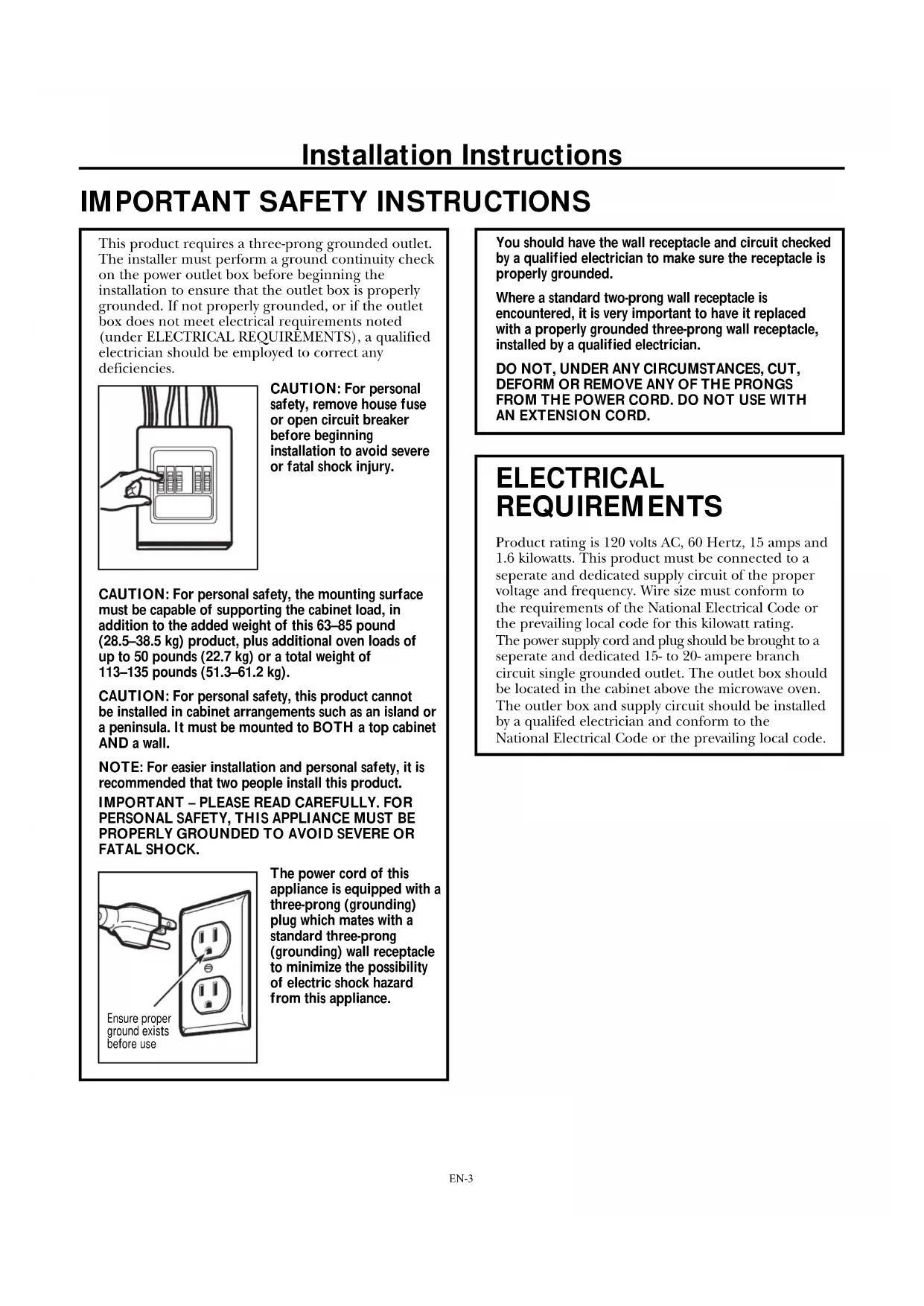 Before You Use Your Microwave .......................... 24 .......................... 2Template Information................... Hood Exhaust .................................................... 14-15 EN-2 5This product requires a three-prong grounded outlet. The installer must perform a ground continuity check on the power outlet box before beginning the installation to ensure that the outlet box is properly grounded. If not properly grounded, or if the outlet box does not meet electrical requirements noted (under ELECTRICAL REQUIREMENTS), a qualified electrician should be employed to correct any deficiencies. CAUTION: For personal safety, remove house fuse or open circuit breaker before beginning installation to avoid severe or fatal shock injury. CAUTION: For personal safety, the mounting surface must be capable of supporting the cabinet load, in addition to the added weight of this 63–85 pound (28.5–38.5 kg) product, plus additional oven loads of up to 50 pounds (22.7 kg) or a total weight of 113–135 pounds (51.3–61.2 kg). CAUTION: For personal safety, this product cannot be installed in cabinet arrangements such as an island or a peninsula. It must be mounted to BOTH a top cabinet AND a wall. NOTE: For easier installation and personal safety, it is recommended that two people install this product.