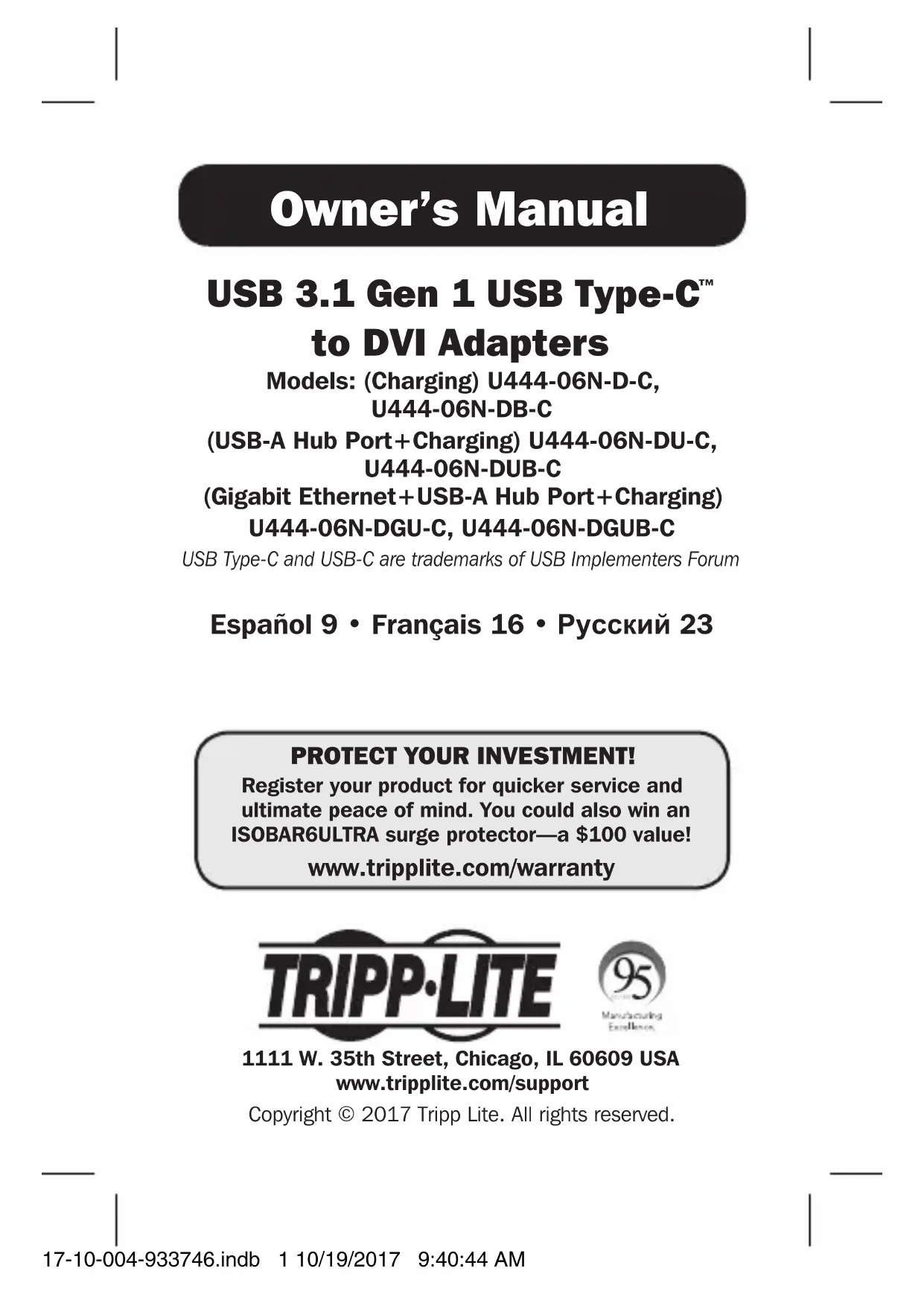 USB Type-C and USB-C are trademarks of USB Implementers Forum Español 9 • Français 16 • Русский 23 PROTECT YOUR INVESTMENT! Register your product for quicker service and ultimate peace of mind. You could also win an ISOBAR6ULTRA surge protector—a $100 value! www.tripplite.com/warranty 1111 W. 35th Street, Chicago, IL 60609 USA www.tripplite.com/supportCopyright © 2017 Tripp Lite. All rights reserved.17-10-004-933746.indb 1 10/19/2017 9:40:44 AM2 Package Includes Product Features