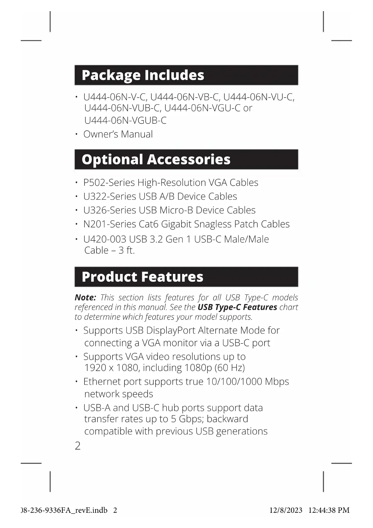 using a UTP cable (such as N201-Series Cat6 cables).** *USB-C port for U444-06N-VU-C and U444-06N-VUB-C models support both data transfer and charging. **See the USB Type-C Features chart for the features your product supports. 23-08-236-9336FA_revE.indb 423-08-236-9336FA_revE.indb 4 12/8/2023 12:44:38 PM12/8/2023 12:44:38 PM5 Models U444-06N-V-C / U444-06N-VB-C U444-06N-VU-C /