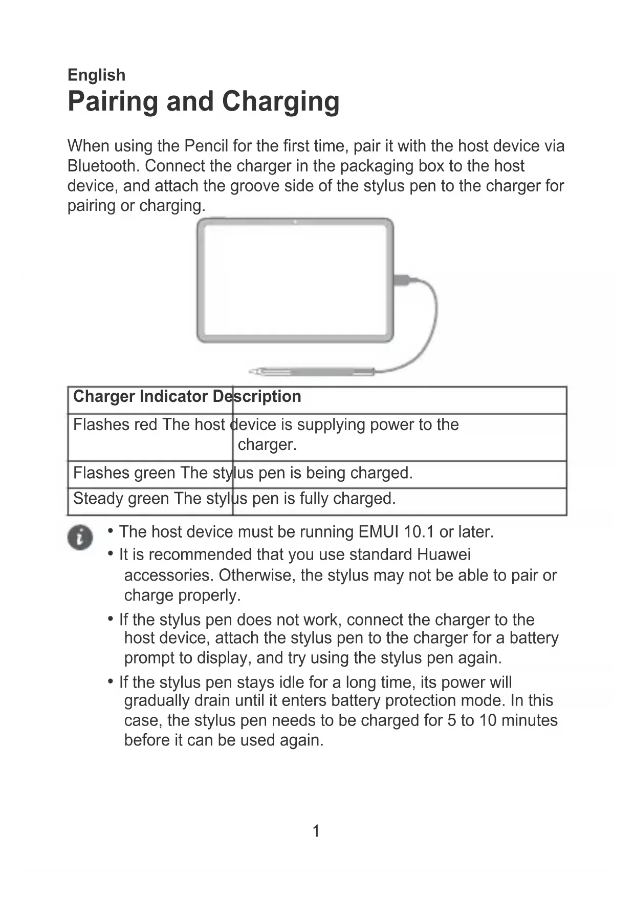 ภาษาไทย ..........................................................................................109 日本語 .............................................................................................115 한국어..............................................................................................119English Pairing and Charging When using the Pencil for the first time, pair it with the host device via Bluetooth. Connect the charger in the packaging box to the host device, and attach the groove side of the stylus pen to the charger for pairing or charging. Charger Indicator Description Flashes red The host device is supplying power to the charger. Flashes green The stylus pen is being charged. Steady green The stylus pen is fully charged.
