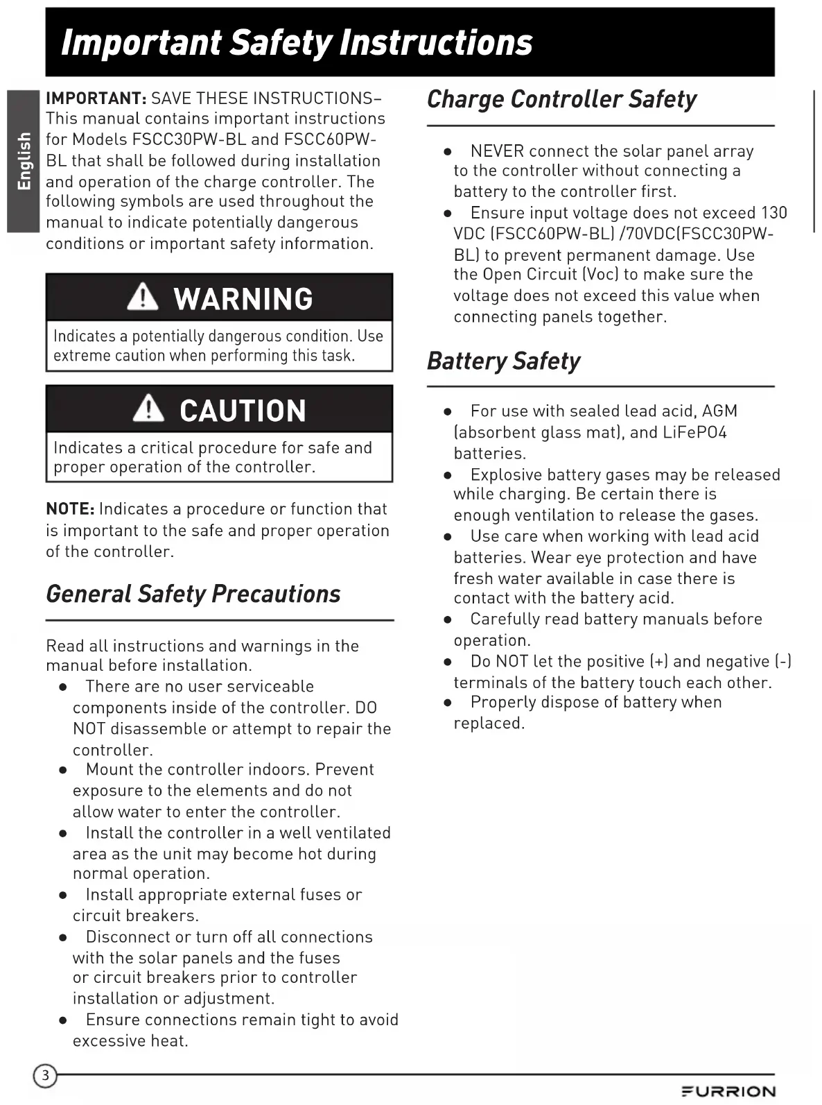 This manual contains important instructions for Models FSCC30PW-BL and FSCC60PW- BL that shall be followed during installation and operation of the charge controller. The following symbols are used throughout the manual to indicate potentially dangerous conditions or important safety information. WARNING Indicates a potentially dangerous condition. Use extreme caution when performing this task. CAUTION Indicates a critical procedure for safe and proper operation of the controller. NOTE: Indicates a procedure or function that is important to the safe and proper operation of the controller. General Safety Precautions Read all instructions and warnings in the manual before installation. ● There are no user serviceable components inside of the controller. DO NOT disassemble or attempt to repair the controller. ● Mount the controller indoors. Prevent exposure to the elements and do not allow water to enter the controller. ● Install the controller in a well ventilated area as the unit may become hot during normal operation. ● Install appropriate external fuses or circuit breakers. ● Disconnect or turn off all connections with the solar panels and the fuses or circuit breakers prior to controller installation or adjustment. ● Ensure connections remain tight to avoid excessive heat. Charge Controller Safety ● NEVER connect the solar panel array to the controller without connecting a battery to the controller first. ● Ensure input voltage does not exceed 130