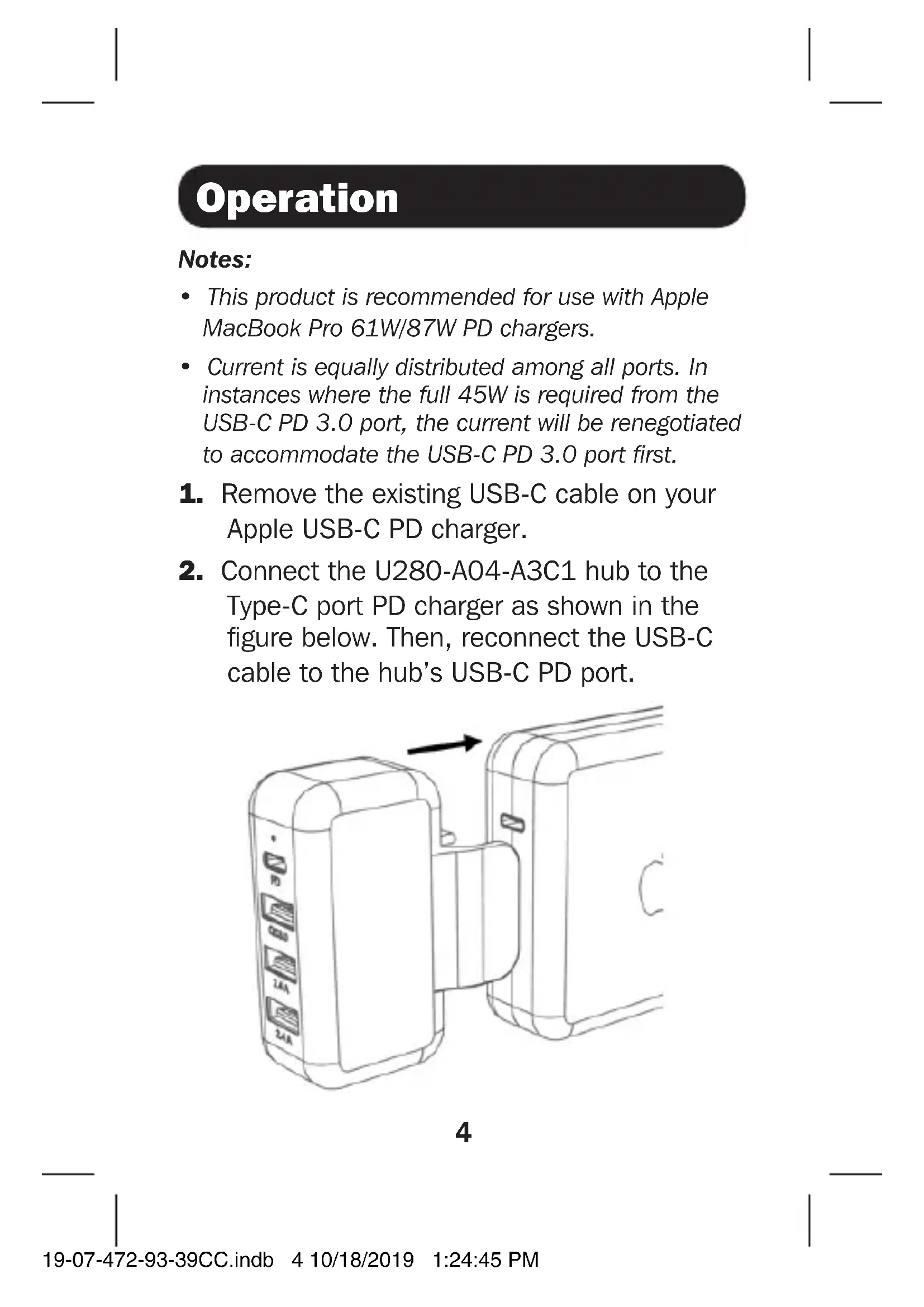 Quick Start Guide Portable Power Expansion Hub for Apple USB-C Power Adapter Model: U280-A04-A3C1 USB Type-C™ and USB-C™ are trademarks of USB Implementers Forum WARRANTY REGISTRATION Register your product today and be automatically entered to win an ISOBAR surge protector in our monthly drawing! tripplite.com/warranty 1111 W. 35th Street, Chicago, IL 60609 USA tripplite.com/supportCopyright © 2019 Tripp Lite. All rights reserved. All trademarks are the property of their respective owners. Español 9 • Français 17 • Русский 25 19-07-472-93-39CC.indb 1 10/18/2019 1:24:45 PM2 Product Features Package Includes