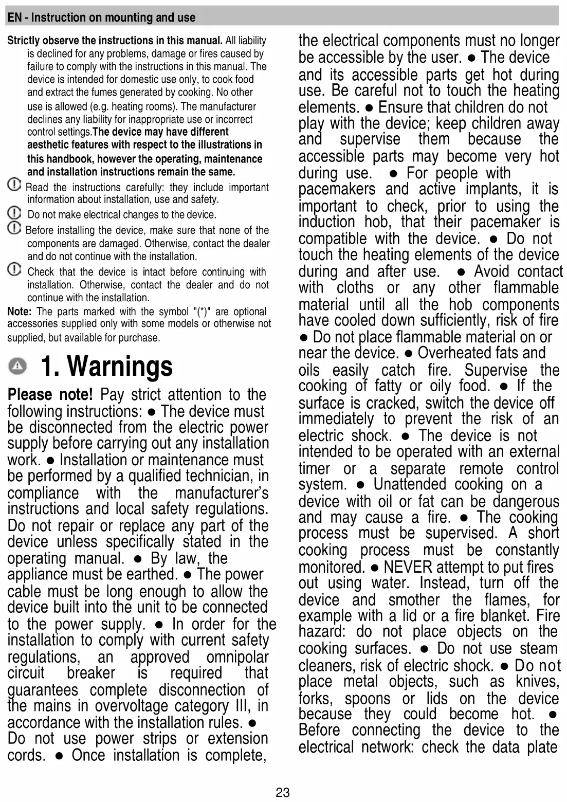Please note! Pay strict attention to the following instructions: ● The device must be disconnected from the electric power supply before carrying out any installation work. ● Installation or maintenance must be performed by a qualified technician, in compliance with the manufacturer’s instructions and local safety regulations. Do not repair or replace any part of the device unless specifically stated in the operating manual. ● By law, the appliance must be earthed. ● The power cable must be long enough to allow the device built into the unit to be connected to the power supply. ● In order for the installation to comply with current safety regulations, an approved omnipolar circuit breaker is required that guarantees complete disconnection of the mains in overvoltage category III, in accordance with the installation rules. ● Do not use power strips or extension cords. ● Once installation is complete, the electrical components must no longer be accessible by the user. ● The device and its accessible parts get hot during use. Be careful not to touch the heating elements. ● Ensure that children do not play with the device; keep children away and supervise them because the accessible parts may become very hot during use. ● For people with pacemakers and active implants, it is important to check, prior to using the induction hob, that their pacemaker is compatible with the device. ● Do not touch the heating elements of the device during and after use. ● Avoid contact with cloths or any other flammable material until all the hob components have cooled down sufficiently, risk of fire ● Do not place flammable material on or near the device. ● Overheated fats and oils easily catch fire. Supervise the cooking of fatty or oily food. ● If the surface is cracked, switch the device off immediately to prevent the risk of an electric shock. ● The device is not intended to be operated with an external timer or a separate remote control system. ● Unattended cooking on a device with oil or fat can be dangerous and may cause a fire. ● The cooking process must be supervised. A short cooking process must be constantly monitored. ● NEVER attempt to put fires out using water. Instead, turn off the device and smother the flames, for example with a lid or a fire blanket. Fire hazard: do not place objects on the cooking surfaces. ● Do not use steam cleaners, risk of electric shock. ● Do not place metal objects, such as knives, forks, spoons or lids on the device because they could become hot. ● Before connecting the device to the electrical network: check the data plate24 (on the bottom of the device) to ensure that the voltage and power correspond to the mains supply and that the power socket is suitable. If in doubt, consult a qualified electrician. Important: ● After use, turn off the hob at the switch and do not rely on the pan detector. ● Prevent liquids from boiling over, so turn the heat down when boiling or heating liquids. ● Do not leave the heating elements turned on with empty pots and pans or with no pans. ● Switch off the relevant hot plate when you have finished cooking. ● Never use aluminium foil for cooking and never place products packaged in aluminium on the hob. The aluminium would melt and irreparably damage your device. ● Never heat a tin or can containing foods without opening it first: it might explode! ● This warning also applies to all other types of hobs. ● High power levels such as the Booster function should not be used to heat certain liquids, such as oil for frying. Excessive heat may be dangerous. In these cases, we recommend the use of a lower power level. ● Containers must be placed directly on the hob and in the centre. Under no circumstances may any other objects be placed between the pan and the hob. ● If the temperature becomes high, the device automatically decreases the power level of the cooking zones. ● Before doing any cleaning or maintenance work, disconnect the device from the mains power supply by removing the plug or turning off the mains switch. Wear protective gloves for all installation and maintenance operations. The device can be used by children over the age of eight and by people with impaired physical, sensory or mental abilities or lacking in experience or the necessary knowledge provided that they are supervised or after they have received instruction about how to safely use the device and understand the inherent dangers. Children must be supervised to ensure they do not play with the device. Cleaning and maintenance must never be performed by children unless they are properly supervised. The room must be properly ventilated when the device is used at the same time as other gas-powered devices, or powered by other fuel. The device must be regularly cleaned both internally and externally (AT LEAST ONCE A MONTH), in strict accordance with the maintenance instructions. Failure to follow the rules for device cleaning and filter replacement and cleaning may result in a fire hazard. Food must never be cooked flambè. Using a naked flame may damage the filters and cause a fire hazard; it must, therefore, be avoided under all circumstances. Extra care must be taken when frying to prevent the oil from overheating and catching fire. ● PLEASE NOTE: The accessible parts of the device may become hot when the hob is switched on. ● Please note! Do not connect the device to the electric power supply until installation has been fully completed. The regulations laid down by local authorities must be strictly followed with regard to the technical and safety measures to adopt for fume extraction. ● The extracted air must not be conveyed through the same ducts used to extract the fumes generated by gas combustion or other types of combustion devices. Never use the device without the grille properly installed! Only use the fastening screws supplied with the device for installation, or if not supplied, purchas