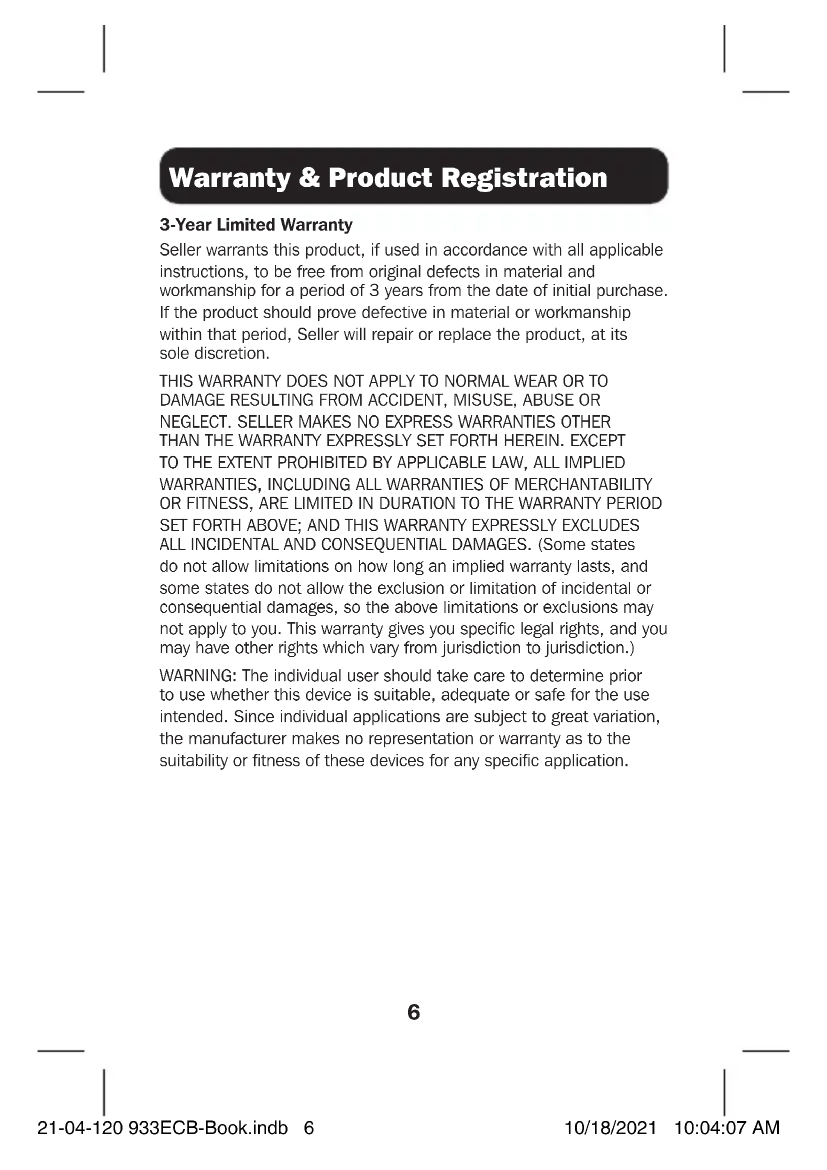 (1.2 x 5 x 5.5 cm) Weight 0.1 lb. (41 g) Warranty Limited Warranty 3-Year Limited Warranty Regulatory Approvals Certifications RoHS, REACH, CE, FCC 21-04-120 933ECB-Book.indb 521-04-120 933ECB-Book.indb 5 10/18/2021 10:04:07 AM10/18/2021 10:04:07 AM6 Warranty & Product Registration 3-Year Limited Warranty Seller warrants this product, if used in accordance with all applicable instructions, to be free from original defects in material and workmanship for a period of 3 years from the date of initial purchase. If the product should prove defective in material or workmanship within that period, Seller will repair or replace the product, at its sole discretion. THIS WARRANTY DOES NOT APPLY TO NORMAL WEAR OR TO DAMAGE RESULTING FROM ACCIDENT, MISUSE, ABUSE OR NEGLECT. SELLER MAKES NO EXPRESS WARRANTIES OTHER THAN THE WARRANTY EXPRESSLY SET FORTH HEREIN. EXCEPT TO THE EXTENT PROHIBITED BY APPLICABLE LAW, ALL IMPLIED
