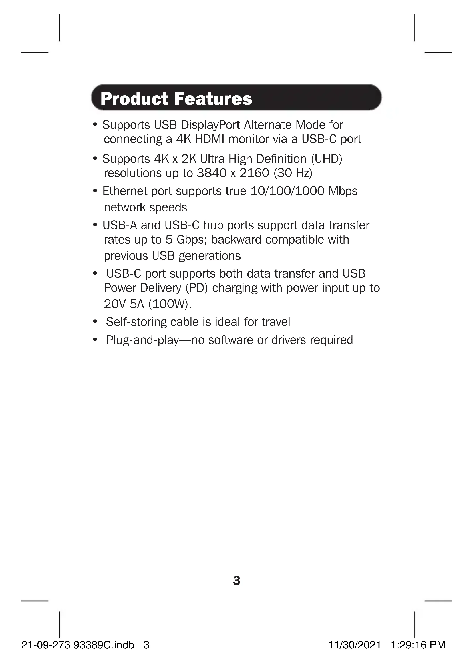 - Plug-and-play—no software or drivers required 21-09-273 93389C.indb 321-09-273 93389C.indb 3 11/30/2021 1:29:16 PM11/30/2021 1:29:16 PM4 Installation Note: When the unit is connected to the USB-C port on your computer and to a network via Cat5e/6 cabling, a network connection will be automatically established. If no connection is made, you can manually establish one by going to your computer’s network settings page. For example, on a Mac you would navigate to the Network section found in System Preferences, click the ‘Assist Me’ button to get to the Network Setup Assistant, then follow the prompts to establish a connection.