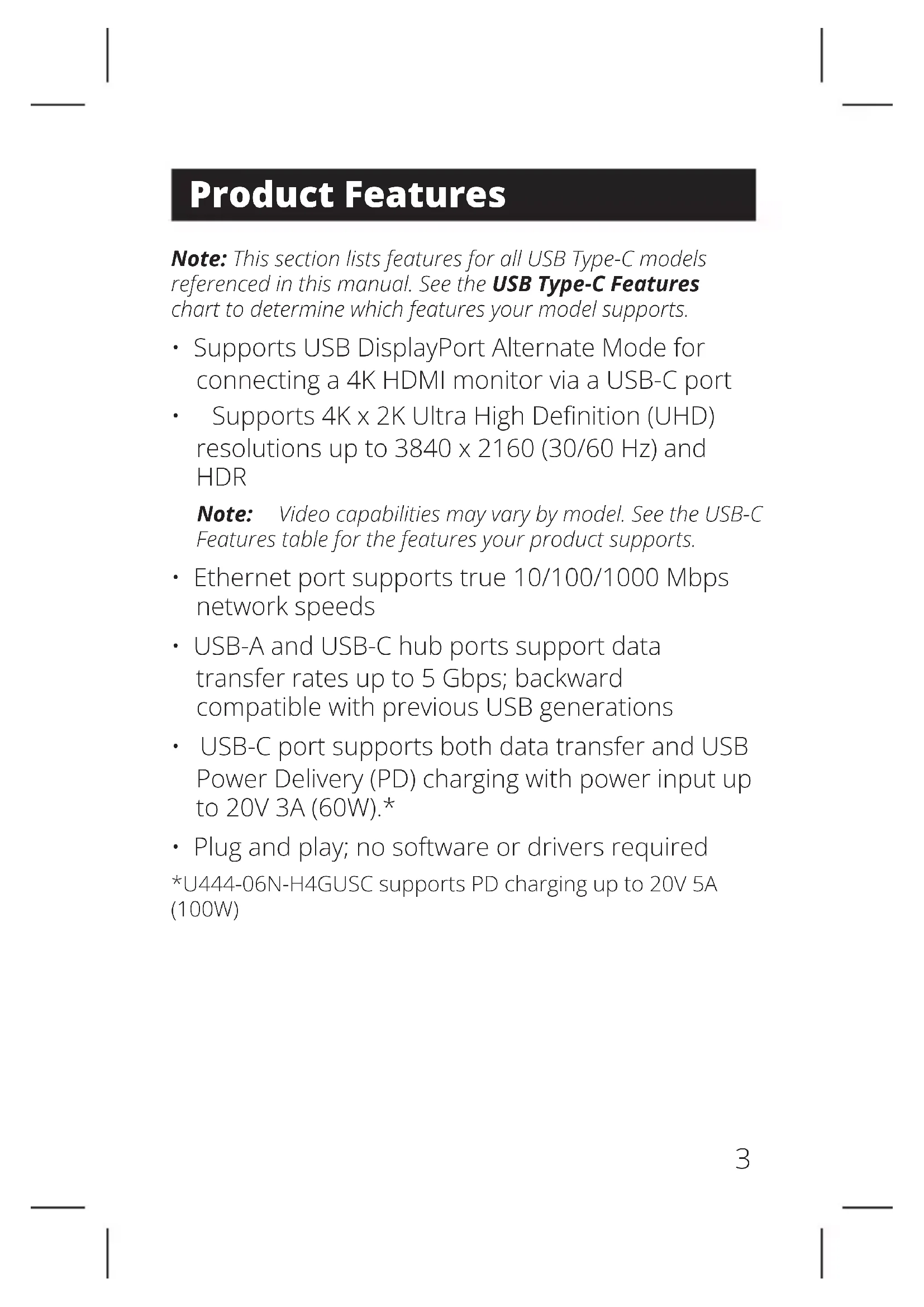- Plug and play; no software or drivers required *U444-06N-H4GUSC supports PD charging up to 20V 5A (100W)4 Product Features USB Type-C Features HDR Video Support