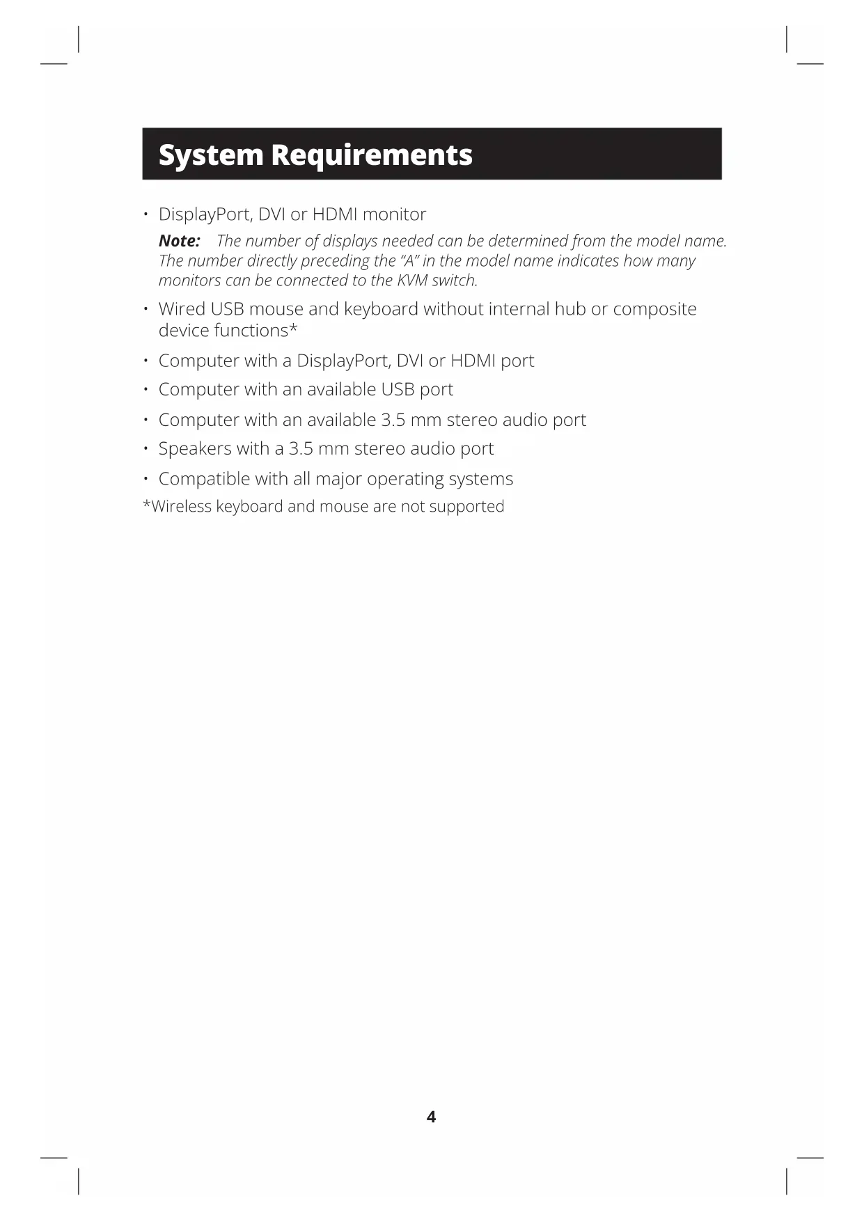 keyboard and mouse ports of the KVM Switch. Note: Keyboards and mice with internal USB hub or composite device functions are not supported. Wireless keyboards and mice are not supported.