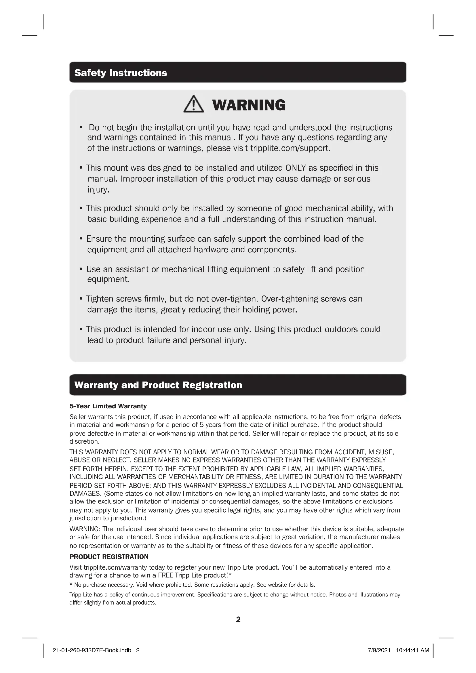 surge protector in our monthly drawing!tripplite.com/warranty 44 lbs 44 lbs (20kg) (20kg) MAX MAX Español 5 • Français 9 • Русский 13 • Deutsch 17 21-01-260-933D7E-Book.indb 121-01-260-933D7E-Book.indb 1 7/9/2021 10:44:41 AM7/9/2021 10:44:41 AM2 Safety Instructions Warranty and Product Registration WARNING
