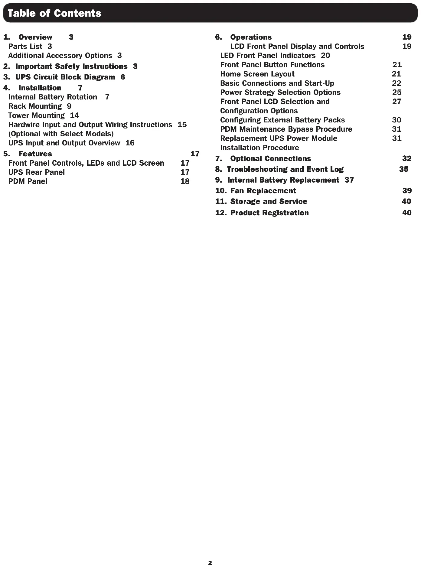 Internal Battery Rotation 7 Rack Mounting 9 Tower Mounting 14 Hardwire Input and Output Wiring Instructions 15 (Optional with Select Models) UPS Input and Output Overview 16