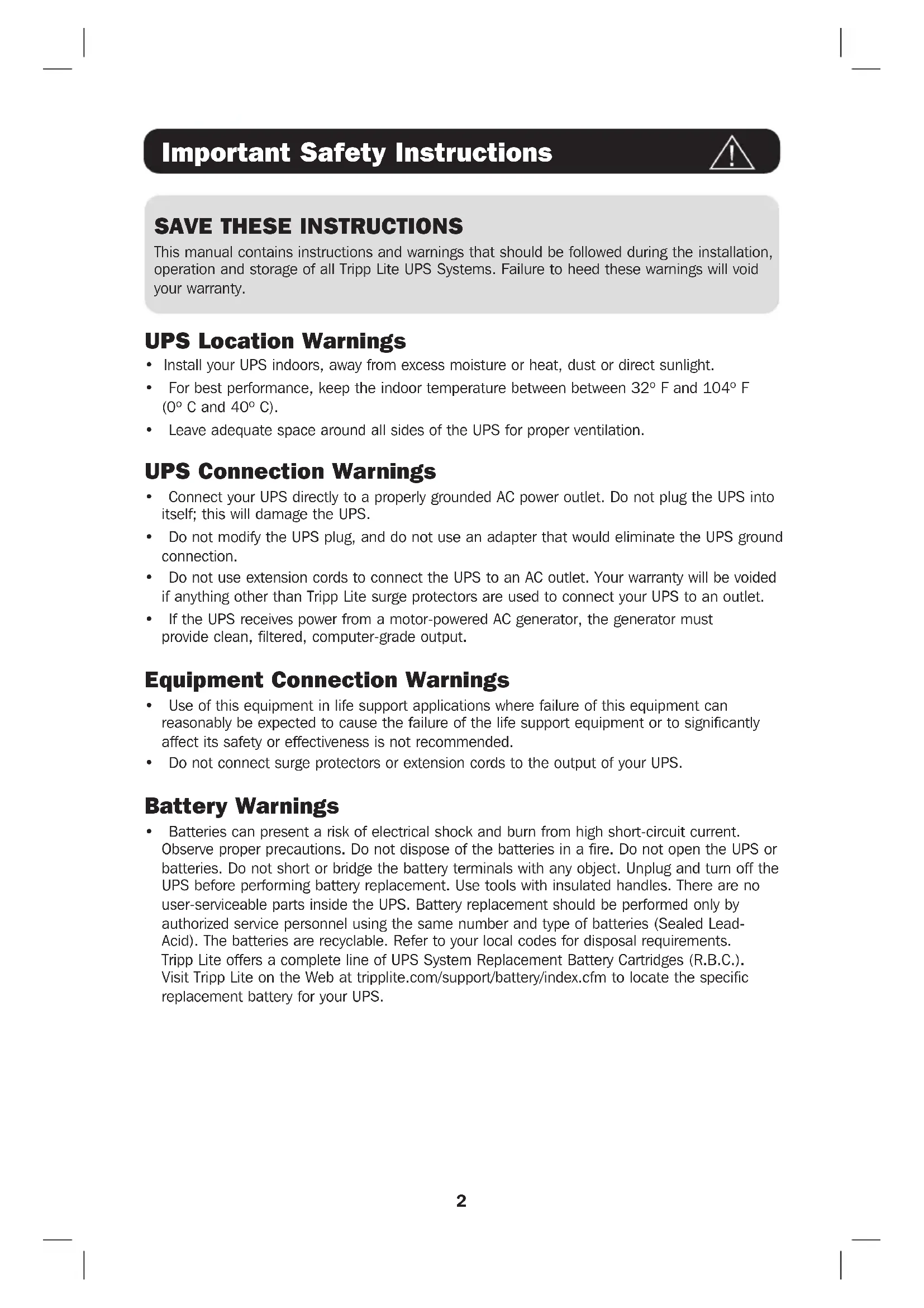 This manual contains instructions and warnings that should be followed during the installation, operation and storage of all Tripp Lite UPS Systems. Failure to heed these warnings will void your warranty.