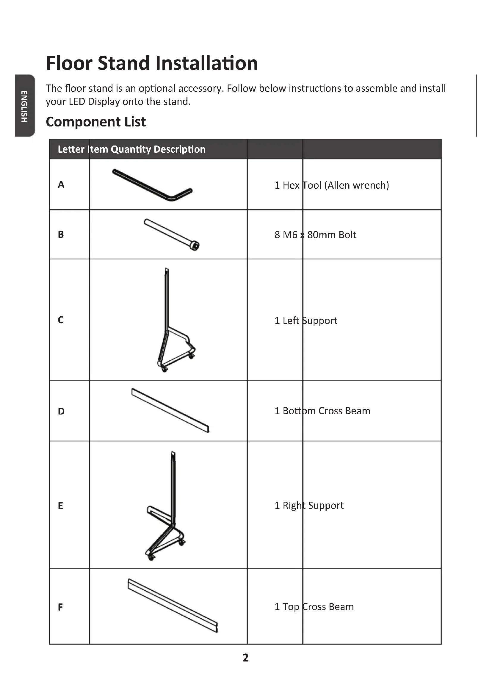 Floor Stand Installaon The oor stand is an oponal accessory. Follow below instrucons to assemble and install your LED Display onto the stand. Component List Leer Item Quanty Descripon