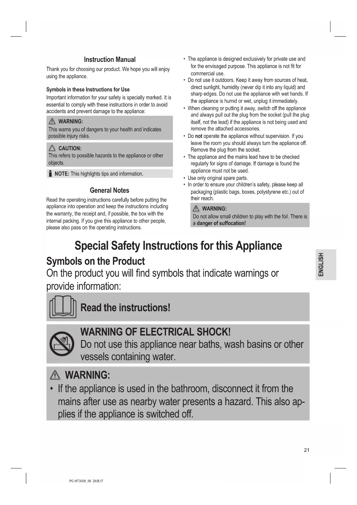 - If the appliance is used in the bathroom, disconnect it from the mains after use as nearby water presents a hazard. This also ap- plies if the appliance is switched off.PC-HT3009_IM 29.08.17