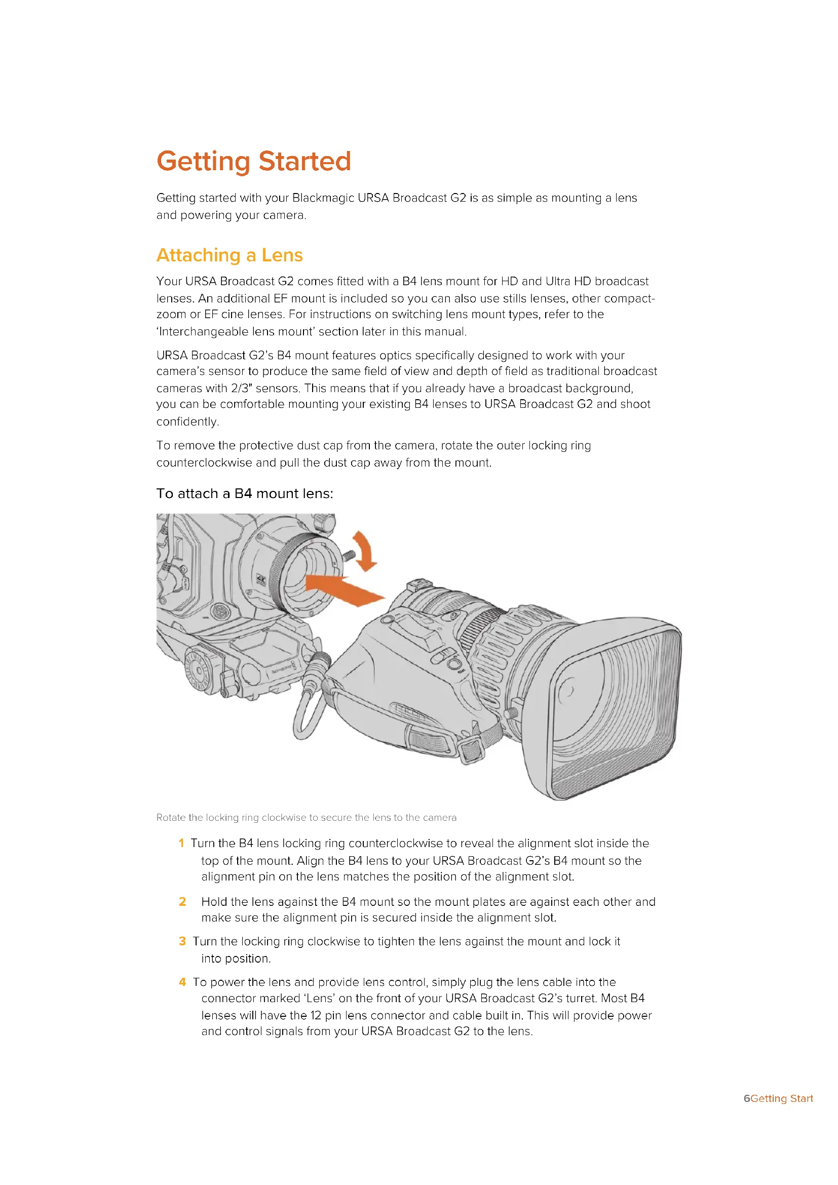 Loosely turn the five mounting screws until initial contact is made with the shoulder of the lens mount. To access all five screws, you will need to rotate the PL locking ring, as some holes are obscured when the ring is either open or closed. Using the 2mm Hex driver, or torque wrench with 2mm Hex key, apply one full turn of pressure to mounting screw 1, followed by one full turn to screw2. Repeat for screws 3and 4, then 5. Continue to apply one full turn to each screw in the sequence above until all screws have reached the maximum torque of 0.45Nm. NOTE When removing the PL mount, simply follow the instructions in reverse order from step 4 to step 1. Don’t forget to remove the PL baffle and store it securely with the PL mount. To attach a PL mount lens: 1 Open your camera’s PL locking ring by rotating it counterclockwise until it stops. 2 Align one of the lens’ four flange notches with the locating pin on the camera mount. Be sure to align the lens for easy viewing of the lens marks. 3 Tighten the PL locking ring by rotating it clockwise. If attaching a PL lens with a servo unit to URSA Broadcast G2, you can also connect the 12 pin broadcast connector for servo control. 204Interchangeable Lens Mount4 To remove the lens, rotate the locking ring counterclockwise until it stops, then gently remove the lens by pulling it directly out from the camera body. There is no need to rotate the lens. Attaching and removing a PL lens Cooke Lenses /i Technology Support The optional Blackmagic URSA Mini Pro PL Mount available for URSA Broadcast G2 features four pins at the 12 o’clock position that are used to communicate with lenses featuring Cooke’s /iTechnology interface. The lenses that support this interface include lenses from Canon, Cooke, Fujinon, Leica and Zeiss. Thislets you record lens information in your clips’ metadata such as the lens model, focal length, aperture setting, focus distance and other lens specific information. When mounting a PLlens with Cooke /iTechnology to URSA Broadcast G2, make sure the lens pins align withthe mount pins at the 12o’clock position The information that is recorded as metadata via Cooke’s /i Technology interface canbe very helpful in post production and VFX. Knowing the lenses used in productionand their precise settings can be helpful in the event that the setup needsto be replicated at a later date. This detailed information can also be utilized by powerful applications such as DaVinciResolve and Blackmagic Fusion for a wide variety of advanced functions. Forexample, the recorded metadata can be used to simulate the specific lens in 3Dspace, or correct lensdistortions. PL Mount Servo Lenses URSA Broadcast G2 supports control of PL 35mm lenses with servo handgrips. When the lens is plugged in to the lens connector on the camera, URSA Broadcast G2 will provide power and control signals to your lens in the same way it does with B4 lenses. For more information refer to the ‘Using Servo Zoom Lenses’ section in this manual. 205Interchangeable Lens MountBlackmagic URSA Broadcast G2 B4 Mount The Broadcast B4 mount is the mount that your URSA Broadcast G2 camera originally ships with. Ifyou have removed the mount to fit the included Blackmagic URSA EF mount or optional URSA PL or F mount, follow these instructions to reattach your B4 mount. Tools Required When attaching the B4 mount, you will need a 2mm Hex driver. While it’s not absolutely required, we recommend using a torque wrench able to accurately set a maximum torque of 0.45Nm to reduce the potential of over tightening the screws. 2mm Hex driver Attaching the B4 Lens Mount