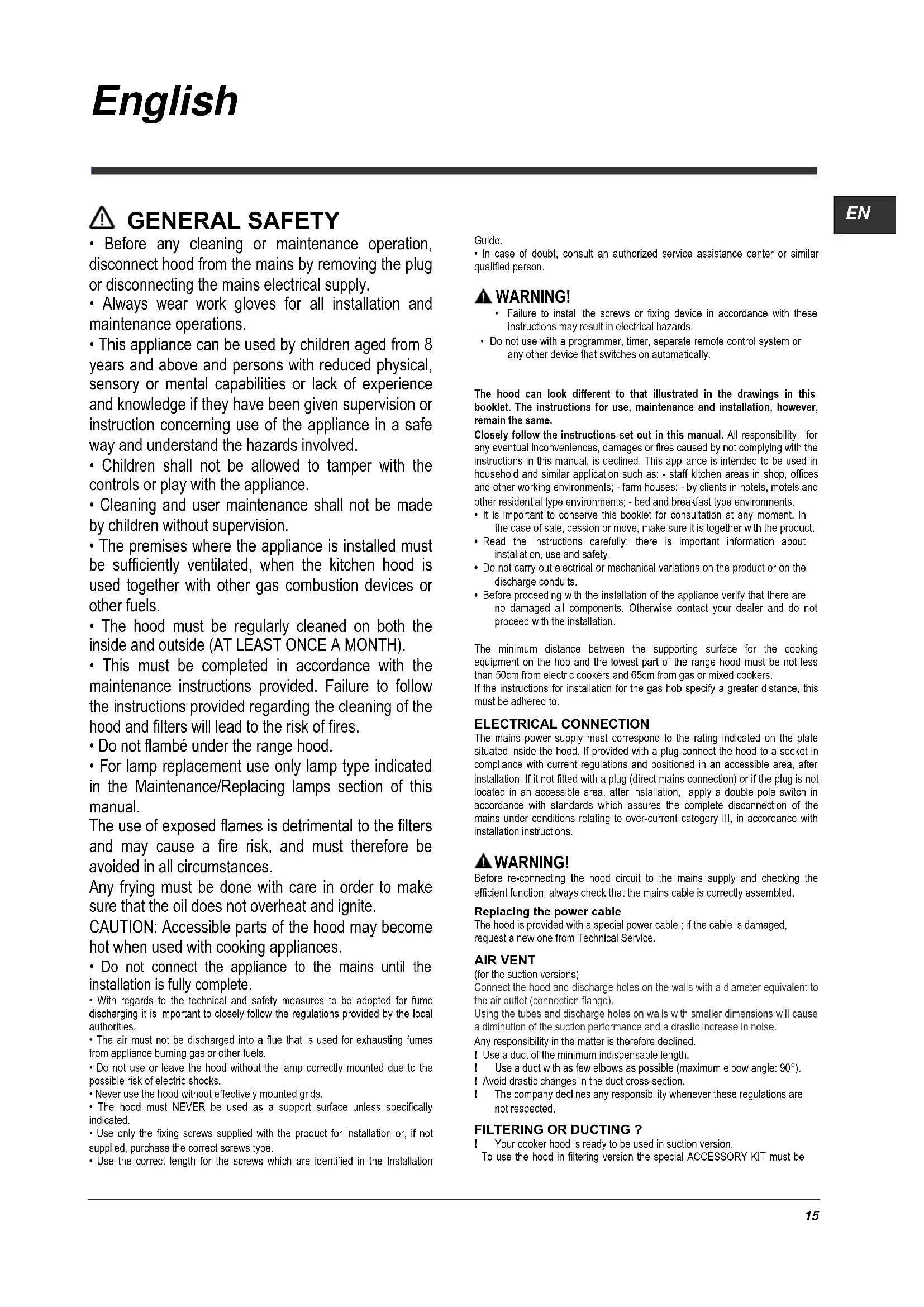 - With regards to the technical and safety measures to be adopted for fume discharging it is important to closely follow the regulations provided by the local authorities. • The air must not be discharged into a flue that is used for exhausting fumes from appliance burning gas or other fuels. • Do not use or leave the hood without the lamp correctly mounted due to the possible risk of electric shocks. • Never use the hood without effectively mounted grids. • The hood must NEVER be used as a support surface unless specifically indicated. • Use only the fixing screws supplied with the product for installation or, if not supplied, purchase the correct screws type. • Use the correct length for the screws which are identified in the Installation Guide. • In case of doubt, consult an authorized service assistance center or similar qualified person. WARNING!