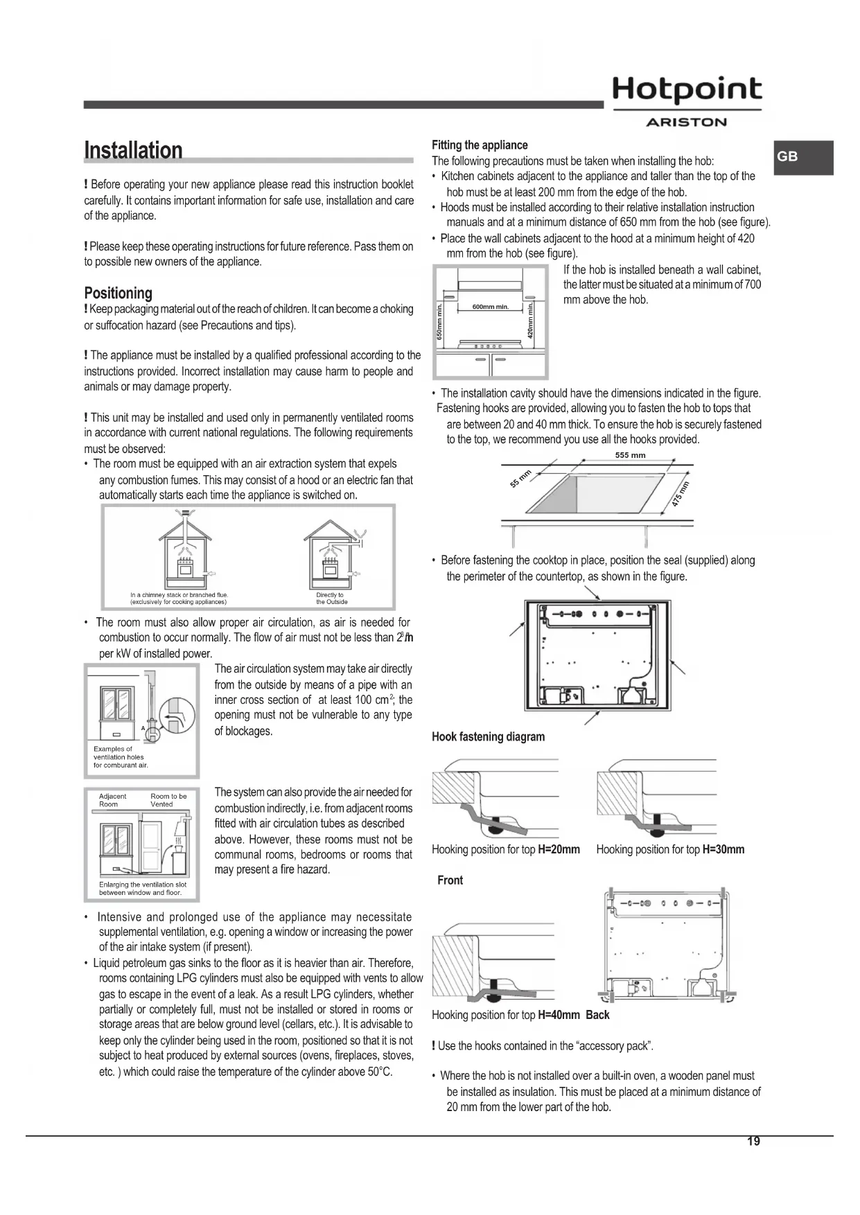 - The installation cavity should have the dimensions indicated in the gure. Fastening hooks are provided, allowing you to fasten the hob to tops that are between 20 and 40 mm thick. To ensure the hob is securely fastened to the top, we recommend you use all the hooks provided. 555 mm 55 mm 475 mm