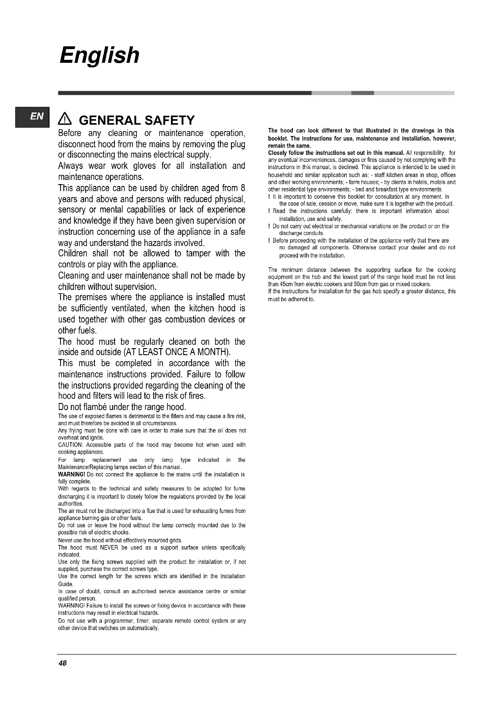 GENERAL SAFETY Before any cleaning or maintenance operation, disconnect hood from the mains by removing the plug or disconnecting the mains electrical supply. Always wear work gloves for all installation and maintenance operations. This appliance can be used by children aged from 8 years and above and persons with reduced physical, sensory or mental capabilities or lack of experience and knowledge if they have been given supervision or instruction concerning use of the appliance in a safe way and understand the hazards involved. Children shall not be allowed to tamper with the controls or play with the appliance. Cleaning and user maintenance shall not be made by children without supervision. The premises where the appliance is installed must be sufficiently ventilated, when the kitchen hood is used together with other gas combustion devices or other fuels. The hood must be regularly cleaned on both the inside and outside (AT LEAST ONCE A MONTH). This must be completed in accordance with the maintenance instructions provided. Failure to follow the instructions provided regarding the cleaning of the hood and filters will lead to the risk of fires. Do not flambé under the range hood. The use of exposed flames is detrimental to the filters and may cause a fire risk, and must therefore be avoided in all circumstances. Any frying must be done with care in order to make sure that the oil does not overheat and ignite. CAUTION: Accessible parts of the hood may become hot when used with cooking appliances. For lamp replacement use only lamp type indicated in the Maintenance/Replacing lamps section of this manual. WARNING! Do not connect the appliance to the mains until the installation is fully complete. With regards to the technical and safety measures to be adopted for fume discharging it is important to closely follow the regulations provided by the local authorities. The air must not be discharged into a flue that is used for exhausting fumes from appliance burning gas or other fuels. Do not use or leave the hood without the lamp correctly mounted due to the possible risk of electric shocks. Never use the hood without effectively mounted grids. The hood must NEVER be used as a support surface unless specifically indicated. Use only the fixing screws supplied with the product for installation or, if not supplied, purchase the correct screws type. Use the correct length for the screws which are identified in the Installation Guide. In case of doubt, consult an authorised service assistance centre or similar qualified person. WARNING! Failure to install the screws or fixing device in accordance with these instructions may result in electrical hazards. Do not use with a programmer, timer, separate remote control system or any other device that switches on automatically. The hood can look different to that illustrated in the drawings in this booklet. The instructions for use, maintenance and installation, however, remain the same. Closely follow the instructions set out in this manual. All responsibility, for any eventual inconveniences, damages or fires caused by not complying with the instructions in this manual, is declined. This appliance is intended to be used in household and similar application such as: - staff kitchen areas in shop, offices and other working environments; - farm houses; - by clients in hotels, motels and other residential type environments; - bed and breakfast type environments. ! It is important to conserve this booklet for consultation at any moment. In the case of sale, cession or move, make sure it is together with the product. ! Read the instructions carefully: there is important information about installation, use and safety. ! Do not carry out electrical or mechanical variations on the product or on the discharge conduits. ! Before proceeding with the installation of the appliance verify that there are no damaged all components. Otherwise contact your dealer and do not proceed with the installation. The minimum distance between the supporting surface for the cooking equipment on the hob and the lowest part of the range hood must be not less than 45cm from electric cookers and 50cm from gas or mixed cookers. If the instructions for installation for the gas hob specify a greater distance, this must be adhered to.49 ELECTRICAL CONNECTION The mains power supply must correspond to the rating indicated on the plate situated inside the hood. If provided with a plug connect the hood to a socket in compliance with current regulations and positioned in an accessible area, after installation. If it not fitted with a plug (direct mains connection) or if the plug is not located in an accessible area, after installation, apply a double pole switch in accordance with standards which assures the complete disconnection of the mains under conditions relating to over-current category III, in accordance with installation instructions. Warning! Before re-connecting the hood circuit to the mains supply and checking the efficient function, always check that the mains cable is correctly assembled. Replacing the power cable The hood is provided with a special power cable ; if the cable is damaged, request a new one from Technical Service. AIR VENT (for the suction versions) Connect the hood and discharge holes on the walls with a diameter equivalent to the air outlet (connection flange). Using the tubes and discharge holes on walls with smaller dimensions will cause a diminution of the suction performance and a drastic increase in noise. Any responsibility in the matter is therefore declined. ! Use a duct of the minimum indispensible length. ! Use a duct with as few elbows as possible (maximum elbow angle: 90°). ! Avoid drastic changes in the duct cross-section. ! The company declines any responsibility whenever these regulations are not respected. FILTERING OR DUCTING ? ! Your cooker hood is ready to be used in suction version. To use the hood in filtering version the special ACCESSORY K