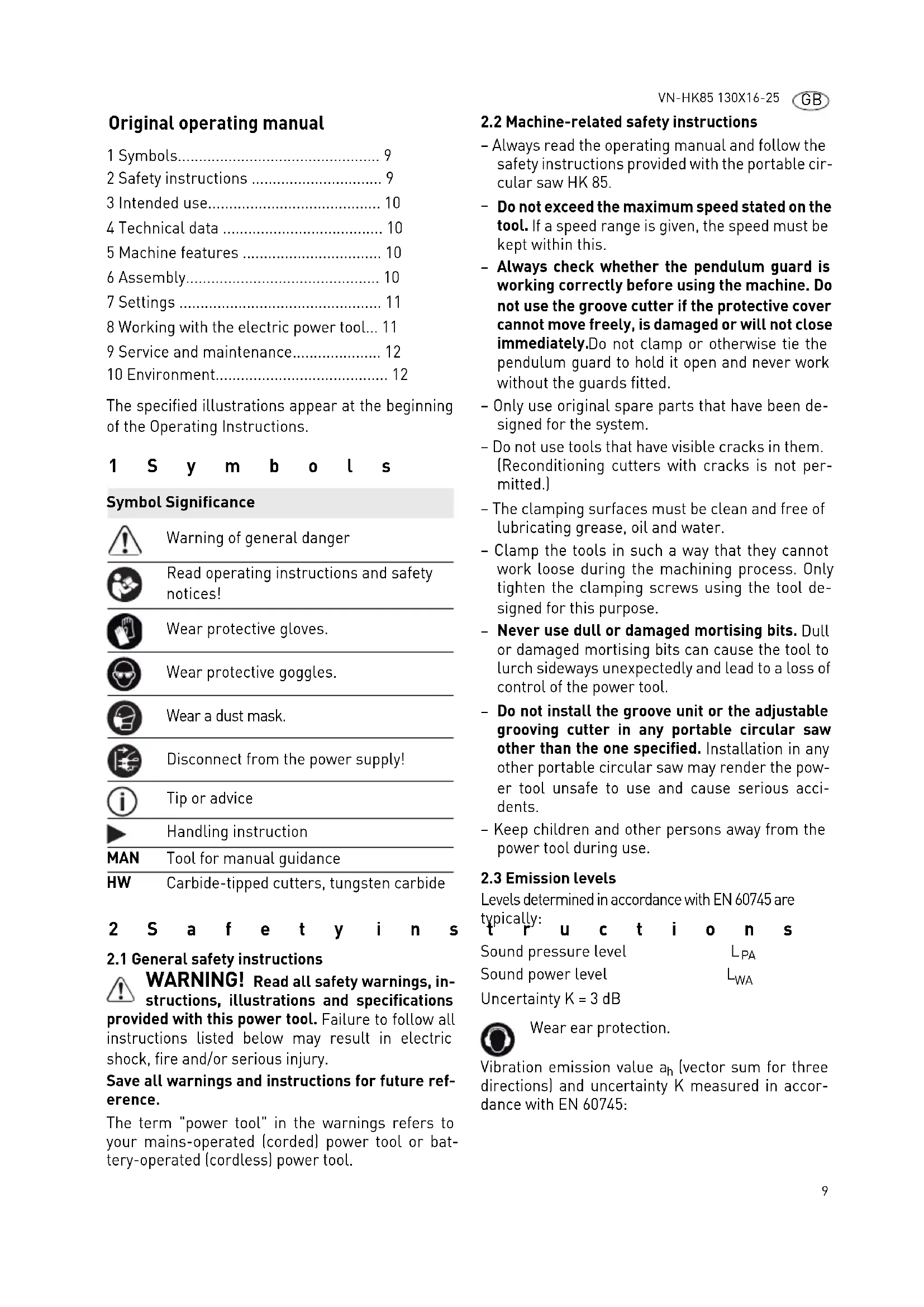 - Always read the operating manual and follow the safety instructions provided with the portable circular saw HK 85.