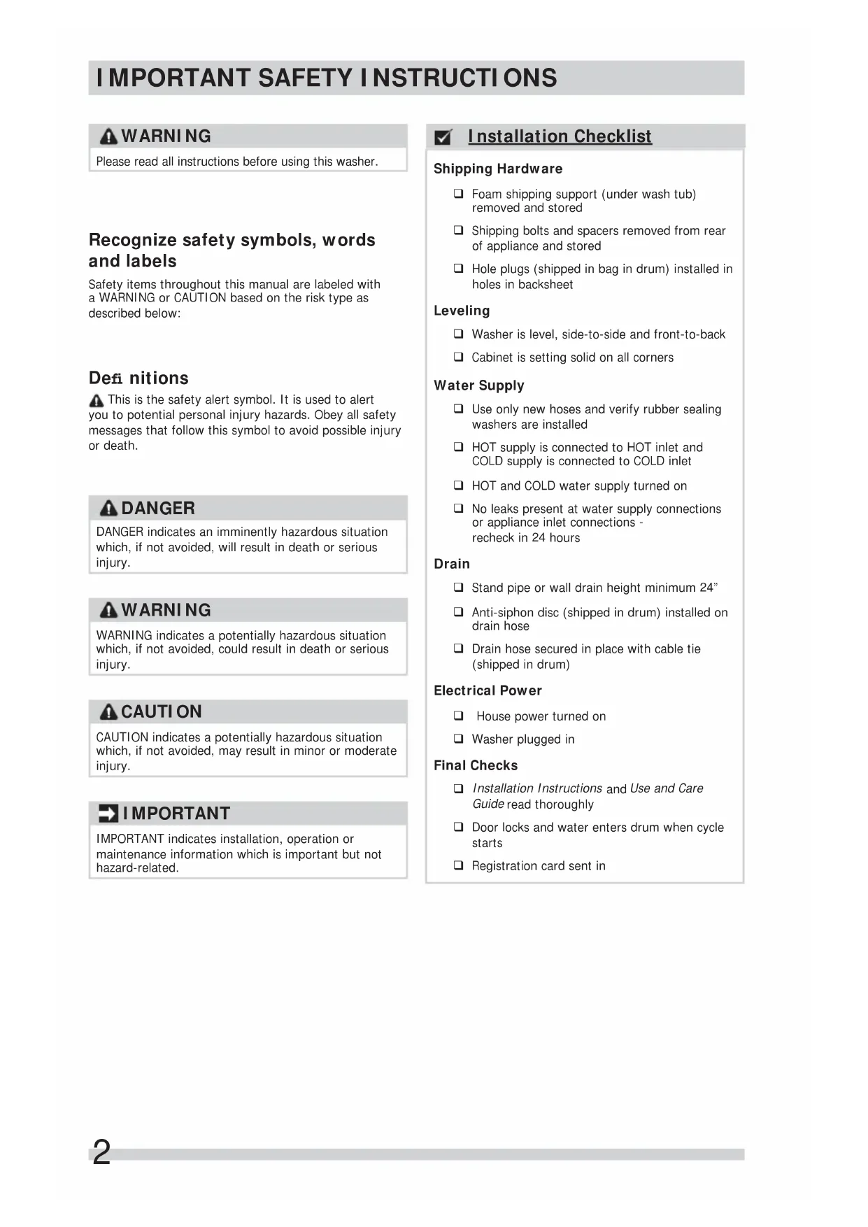 Shipping Hardware Foam shipping support (under wash tub) removed and stored Shipping bolts and spacers removed from rear of appliance and stored Hole plugs (shipped in bag in drum) installed in holes in backsheet Leveling Washer is level, side-to-side and front-to-back Cabinet is setting solid on all corners Water Supply Use only new hoses and verify rubber sealing washers are installed HOT supply is connected to HOT inlet and COLD supply is connected to COLD inlet HOT and COLD water supply turned on No leaks present at water supply connections or appliance inlet connections -recheck in 24 hours Drain Stand pipe or wall drain height minimum 24” Anti-siphon disc (shipped in drum) installed on drain hose Drain hose secured in place with cable tie (shipped in drum) Electrical Power House power turned on Washer plugged in Final Checks Installation Instructions and Use and Care Guide read thoroughly Door locks and water enters drum when cycle starts Registration card sent in Installation Checklist Defi nitions This is the safety alert symbol. It is used to alert you to potential personal injury hazards. Obey all safety messages that follow this symbol to avoid possible injury or death. Recognize safety symbols, words and labels Safety items throughout this manual are labeled with a WARNING or CAUTION based on the risk type as described below: IMPORTANT IMPORTANT indicates installation, operation or maintenance information which is important but not hazard-related. WARNING WARNING indicates a potentially hazardous situation which, if not avoided, could result in death or serious injury. WARNING Please read all instructions before using this washer. CAUTION CAUTION indicates a potentially hazardous situation which, if not avoided, may result in minor or moderate injury. DANGER DANGER indicates an imminently hazardous situation which, if not avoided, will result in death or serious injury.3