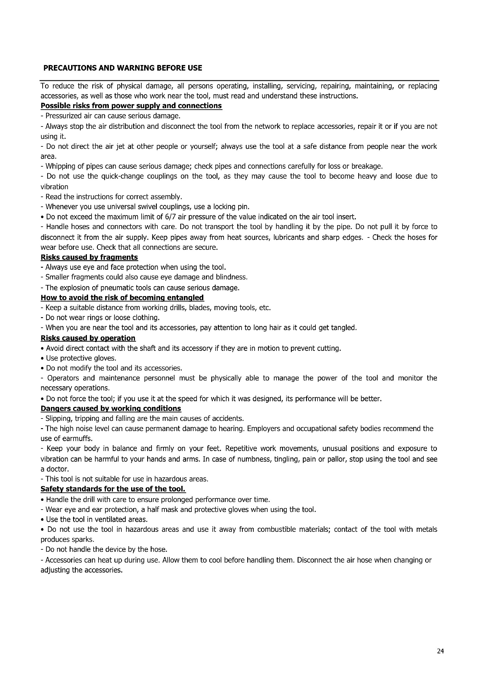 - Do not exceed the maximum limit of 6/7 air pressure of the value indicated on the air tool insert. - Handle hoses and connectors with care. Do not transport the tool by handling it by the pipe. Do not pull it by force to disconnect it from the air supply. Keep pipes away from heat sources, lubricants and sharp edges. - Check the hoses for wear before use. Check that all connections are secure. Risks caused by fragments - Always use eye and face protection when using the tool. - Smaller fragments could also cause eye damage and blindness. - The explosion of pneumatic tools can cause serious damage. How to avoid the risk of becoming entangled - Keep a suitable distance from working drills, blades, moving tools, etc. - Do not wear rings or loose clothing. - When you are near the tool and its accessories, pay attention to long hair as it could get tangled. Risks caused by operation