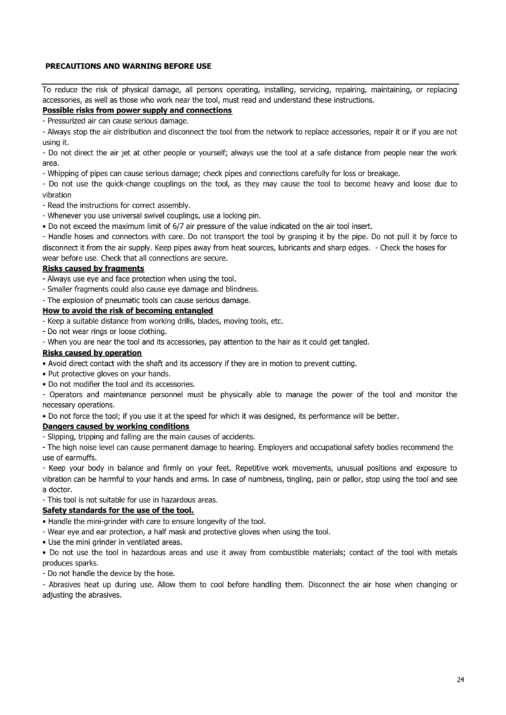 - Do not exceed the maximum limit of 6/7 air pressure of the value indicated on the air tool insert. - Handle hoses and connectors with care. Do not transport the tool by grasping it by the pipe. Do not pull it by force to disconnect it from the air supply. Keep pipes away from heat sources, lubricants and sharp edges. - Check the hoses for wear before use. Check that all connections are secure. Risks caused by fragments - Always use eye and face protection when using the tool. - Smaller fragments could also cause eye damage and blindness. - The explosion of pneumatic tools can cause serious damage. How to avoid the risk of becoming entangled - Keep a suitable distance from working drills, blades, moving tools, etc. - Do not wear rings or loose clothing. - When you are near the tool and its accessories, pay attention to the hair as it could get tangled. Risks caused by operation