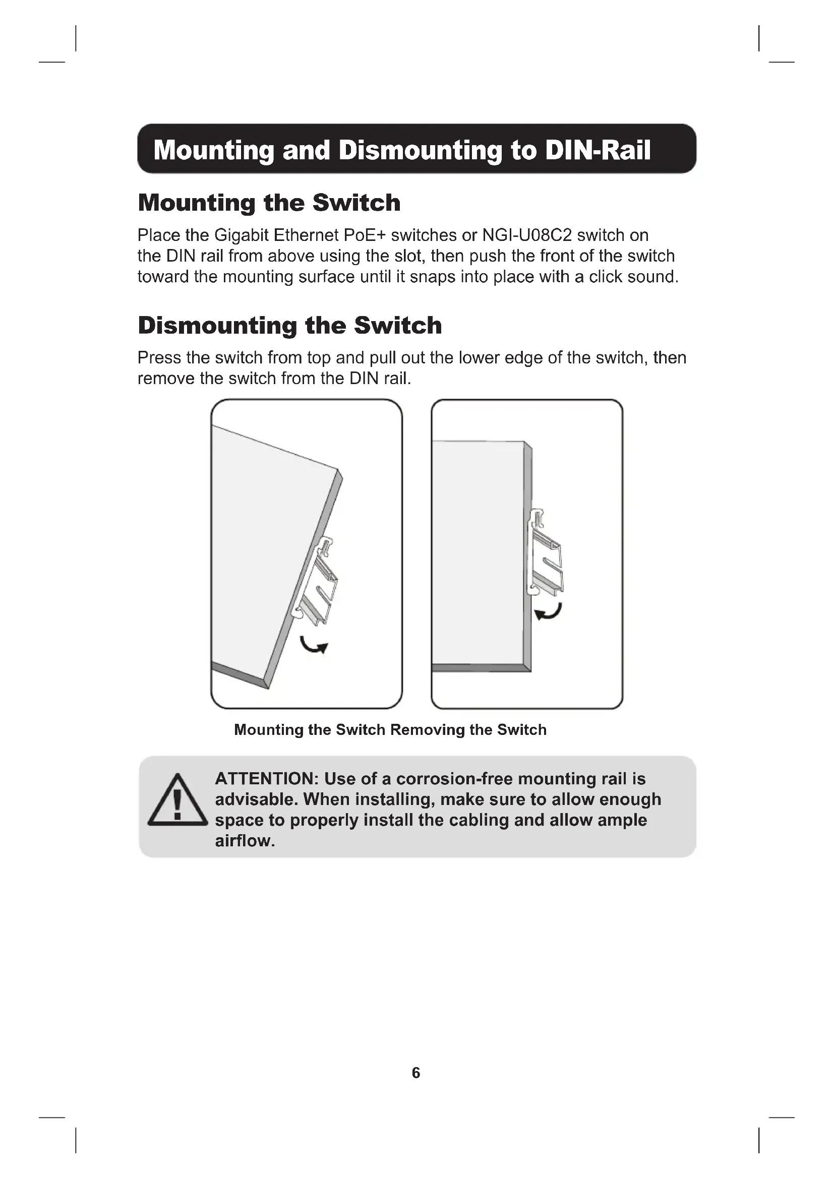 Product Overview Top View Top View Front View Front View Grounding Screw Grounding Screw DIP Switches Power Input Terminal Block Power Input Terminal Block Reset Reset PWR SFP SFP PoE+ PoE+ 1000Mbps (Green) 1000Mbps (Green) LNK/ACT (Green) LNK/ACT (Green) SFP (1000Mbps) SFP ALM RPS PWR6 Mounting and Dismounting to DIN-Rail Mounting the Switch Place the Gigabit Ethernet PoE+ switches or NGI-U08C2 switch on the DIN rail from above using the slot, then push the front of the switch toward the mounting surface until it snaps into place with a click sound. Dismounting the Switch Press the switch from top and pull out the lower edge of the switch, then remove the switch from the DIN rail. ATTENTION: Use of a corrosion-free mounting rail is advisable. When installing, make sure to allow enough space to properly install the cabling and allow ample airow. Mounting the Switch Removing the Switch7 Mounting and Dismounting to DIN-Rail Wiring Requirements