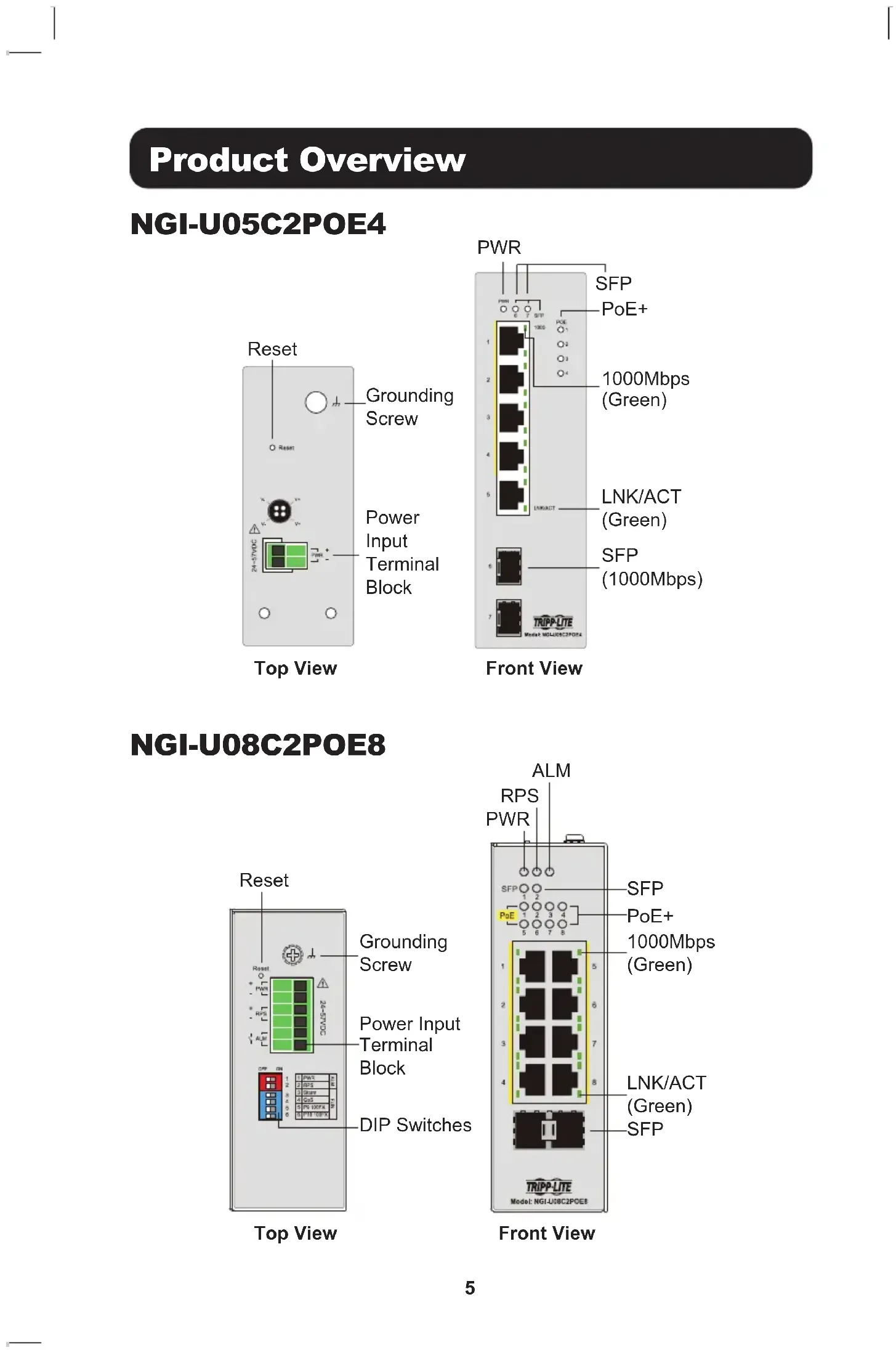 - User-congurableDIPswitchesforalarms(NGI-U08C2POE8Only)4 NGI-U08C2 (non-PoE) NGI-U05POE4 Product Overview Grounding Screw DIN-Rail 1000Mbps 1000Mbps (Green) PoE+ LNK/ACT LNK/ACT (Green) ALM RPS PWR PWR SFP Reset SFP Grounding Screw Grounding Screw Power Input Terminal Block Power Input Terminal Block DIP Switches Top View Top View Front View Front View5