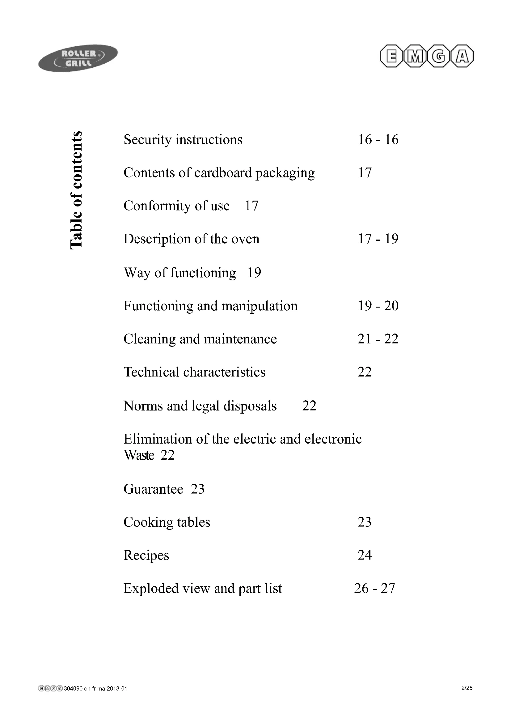 (*304.090) You should read these user instructions carefully before using the appliance304090 en-fr ma 2018-01 2/25 Security instructions 16 - 16 Contents of cardboard packaging 17 Conformity of use 17 Description of the oven 17 - 19 Way of functioning 19 Functioning and manipulation 19 - 20 Cleaning and maintenance 21 - 22 Technical characteristics 22 Norms and legal disposals 22 Elimination of the electric and electronic Waste 22 Guarantee 23 Cooking tables 23 Recipes 24 Exploded view and part list 26 - 27 Table of contents304090 en-fr ma 2018-01 3/25 MULTIFUNCTION OVEN FCV 280 Congratulations for the acquisition of this upmarket appliance made in France. You chose an appliance which alloys the best technical qualities with a big user-friendliness. We wish you the biggest contentment 1. SECURITY INSTRUCTIONSPlease respect these instructions scrupulously to avoid any risk of fire, electric shock, scald or other wounds and damage. During the use of this appliance, fundamental cir- cumspection of security must always be noticed, such as: - Take into account the instructions and keep it systemati- cally with the appliance. - Install the appliance always in instructions respect. A 10 cm distance minimum with the partition or the wall is nec- essary. - This machine is for indoor use. Do not use it outdoor. - Protect the appliance from direct light of the sun, frost and humidity. - This device is not planned to be used by people (including the children) whose physical, sensory or mental abilities are reduced, or people divested of experience or knowledge, unless they were able to benefit, through a per- son responsible for their security, for a surveillance or for preliminary instructions concerning the use of the device. - Never move the appliance when it is working or when the surfaces of cooking are still hot. - Check that the appliance is definitely off (0) before con- necting it up or disconnecting it.304090 en-fr ma 2018-01 4/25 - Do not touch the hot surfaces of the appliance. The tem- perature of the hot surfaces can be very important when the appliance is working. Always use handles and control knobs. - Do not use the appliance for other functions than deter- mined use.- Do not leave the electrical cord in contact of hot surfaces. - The appliance should not be used close to combustible materials. - During use, look after not to obstruct neither hearings of aeration of the appliance nor of the built-in frame. Always ensure of the correct ventilation around the oven during use. - To avoid any electric shock, never plunge the appliance, the cord or plug in water or quite other liquid. - Entrust repairs only to a skilled person. - Use only spare parts of origin. - At the end of cooking, before cleaning the appliance, do not forget to disconnect it. - So as to quickly evacuate cooking condensation water, al- ways leave the door open when cooling the oven off.304090 en-fr ma 2018-01 5/25