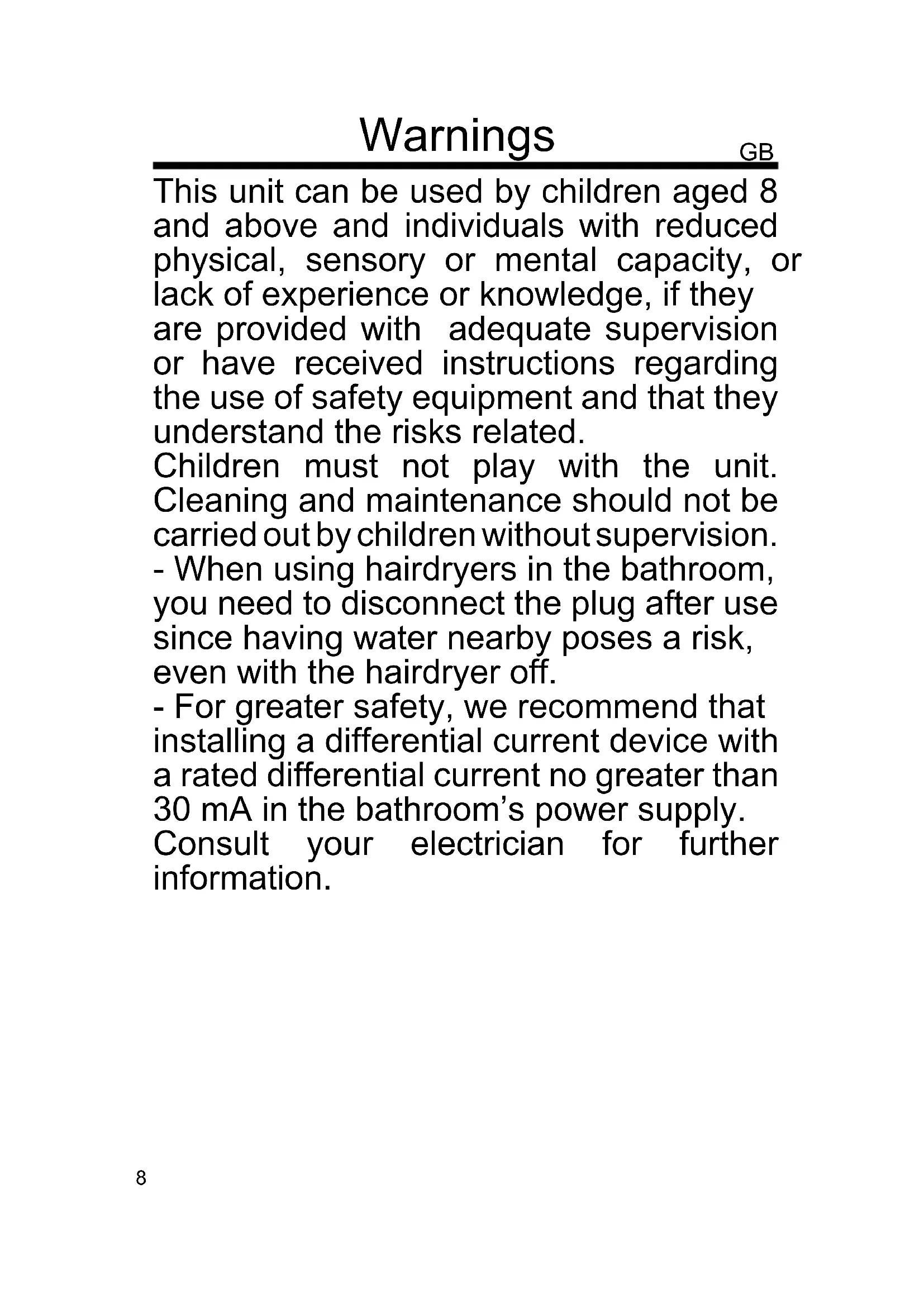 This unit can be used by children aged 8 and above and individuals with reduced physical, sensory or mental capacity, or lack of experience or knowledge, if they are provided with adequate supervision or have received instructions regarding the use of safety equipment and that they understand the risks related. Children must not play with the unit. Cleaning and maintenance should not be carried out by children without supervision. - When using hairdryers in the bathroom, you need to disconnect the plug after use since having water nearby poses a risk, even with the hairdryer off. - For greater safety, we recommend that installing a differential current device with a rated differential current no greater than 30 mA in the bathroom’s power supply. Consult your electrician for further information. 8Do not use this appliance while bathing or in a shower.