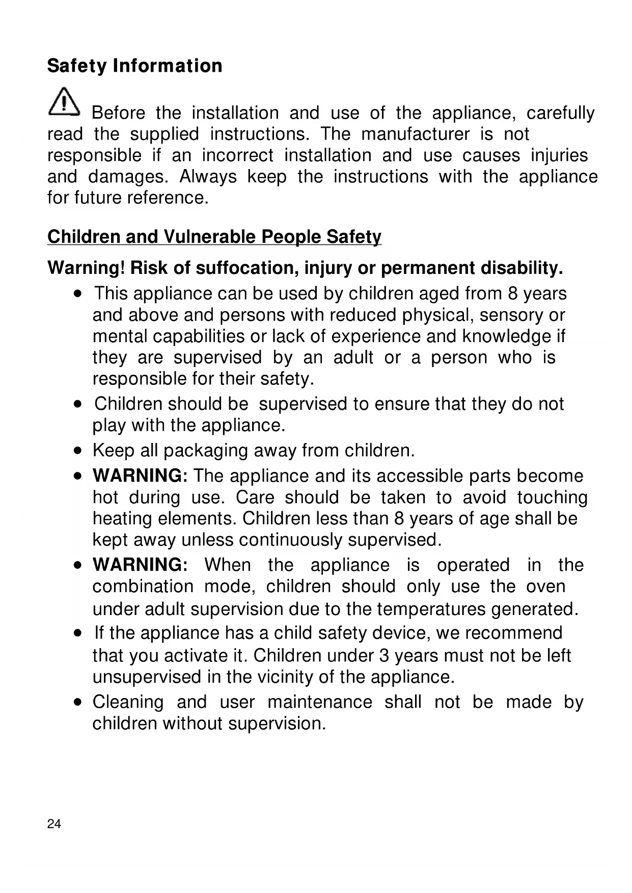 - Installation Safety Information Before the installation and use of the appliance, carefully read the supplied instructions. The manufacturer is not responsible if an incorrect installation and use causes injuries and damages. Always keep the instructions with the appliance for future reference. Children and Vulnerable People Safety Warning! Risk of suffocation, injury or permanent disability. This appliance can be used by children aged from 8 years and above and persons with reduced physical, sensory or mental capabilities or lack of experience and knowledge if they are supervised by an adult or a person who is responsible for their safety. Children should be supervised to ensure that they do not play with the appliance. Keep all packaging away from children. p. 8524