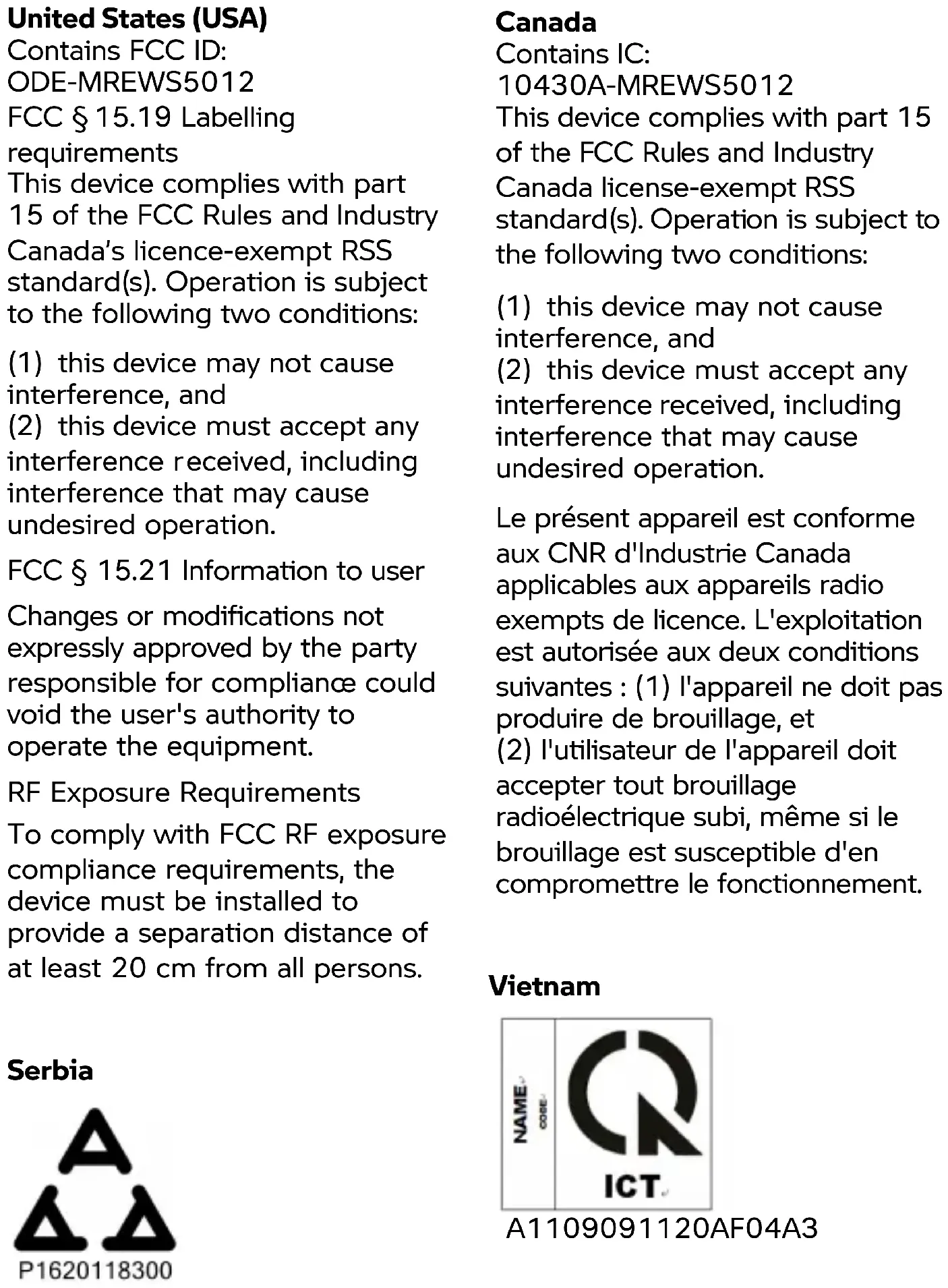 requirements This device complies with part 15 of the FCC Rules and Industry Canada’s licence-exempt RSS standard(s). Operation is subject to the following two conditions: (1) this device may not cause interference, and (2) this device must accept any interference r eceived, including interference that may cause undesired operation. FCC § 15.21 Information to user Changes or modifications not expressly approved by the party responsible for complianc e could void the user's authority to operate the equipment. RF Exposure Requirements To comply with FCC RF exposure compliance requirements, the device must be installed to provide a separation distance of at least 20 cm from all persons. Canada Contains IC: 10430A-MREWS5012 This device complies with part 15 of the FCC Rules and Industry Canada license-exempt RSS standard(s). Operation is subject to the following two conditions: (1) this device may not cause interference, and (2) this device must accept any interference received, including interference that may cause undesired operation. Le présent appareil est conforme aux CNR d'Industrie Canada applicables aux appareils radio exempts de licence. L'exploitation est autorisée aux deux conditions suivantes : (1) l'appareil ne doit pas produire de brouillage, et (2) l'utilisateur de l'appareil doit accepter tout brouillage radioélectrique subi, même si le brouillage est susceptible d'en compromettre le fonctionnement. Serbia Vietnam A1109091120AF04A3Certifications BMW Keyless Ride ID Device USA, Canada: Product name: BMW