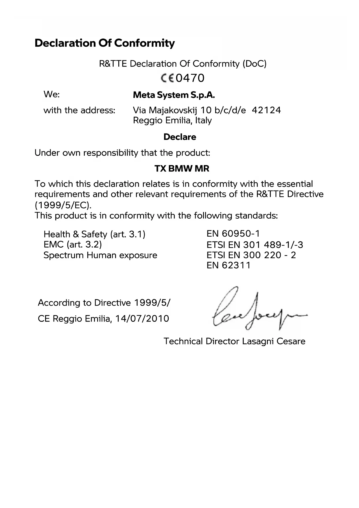 We: with the address: Meta System S.p.A. Via Majakovskij 10 b/c/d/e 42124 Reggio Emilia, Italy Declare Under own responsibility that the product: