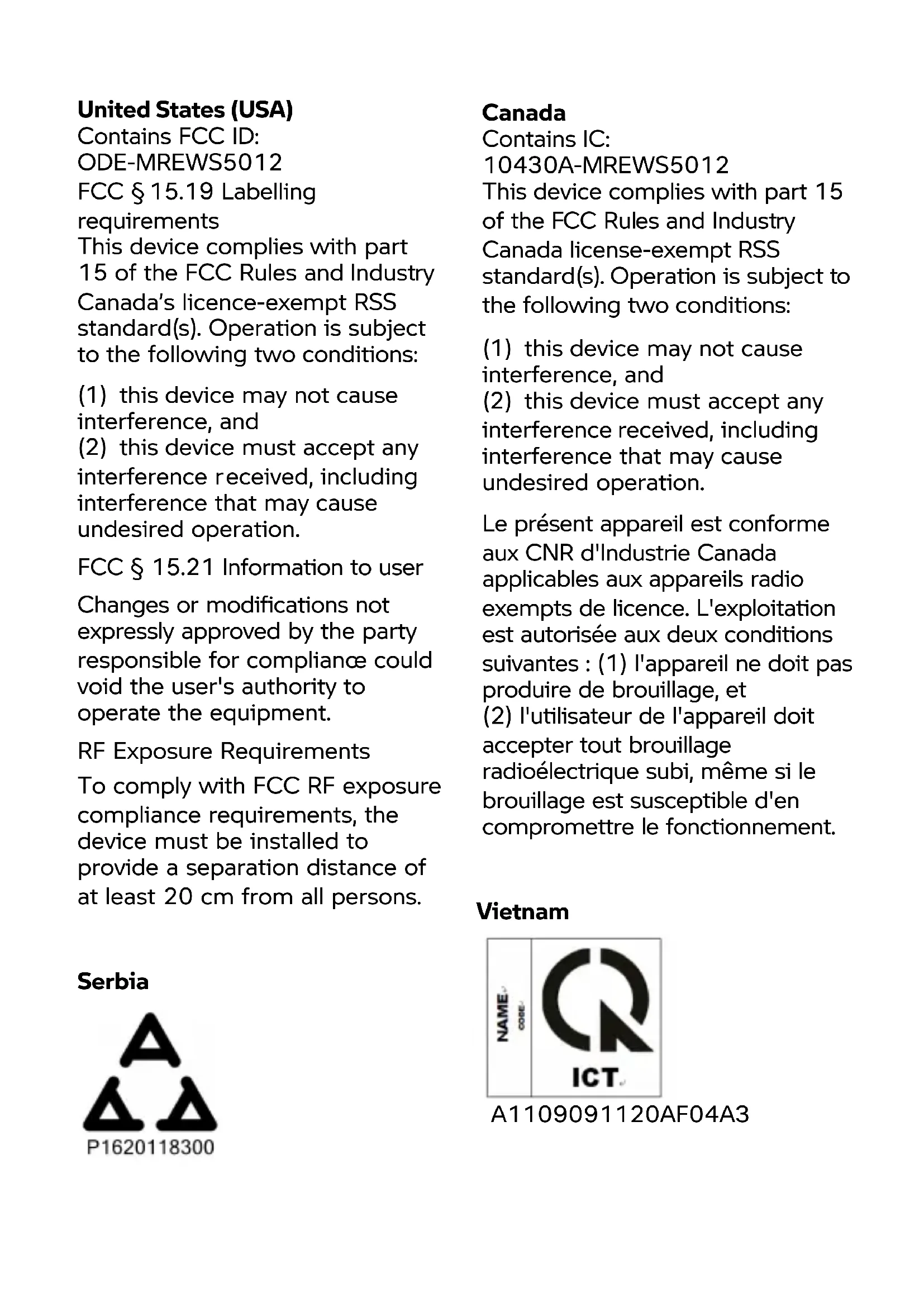 requirements This device complies with part 15 of the FCC Rules and Industry Canada’s licence-exempt RSS standard(s). Operation is subject to the following two conditions: (1) this device may not cause interference, and (2) this device must accept any interference r eceived, including interference that may cause undesired operation. FCC § 15.21 Information to user Changes or modifications not expressly approved by the party responsible for complianc e could void the user's authority to operate the equipment. RF Exposure Requirements To comply with FCC RF exposure compliance requirements, the device must be installed to provide a separation distance of at least 20 cm from all persons. Canada Contains IC: 10430A-MREWS5012 This device complies with part 15 of the FCC Rules and Industry Canada license-exempt RSS standard(s). Operation is subject to the following two conditions: (1) this device may not cause interference, and (2) this device must accept any interference received, including interference that may cause undesired operation. Le présent appareil est conforme aux CNR d'Industrie Canada applicables aux appareils radio exempts de licence. L'exploitation est autorisée aux deux conditions suivantes : (1) l'appareil ne doit pas produire de brouillage, et (2) l'utilisateur de l'appareil doit accepter tout brouillage radioélectrique subi, même si le brouillage est susceptible d'en compromettre le fonctionnement. Serbia Vietnam A1109091120AF04A3Certifications BMW Keyless Ride ID Device USA, Canada: Product name: BMW