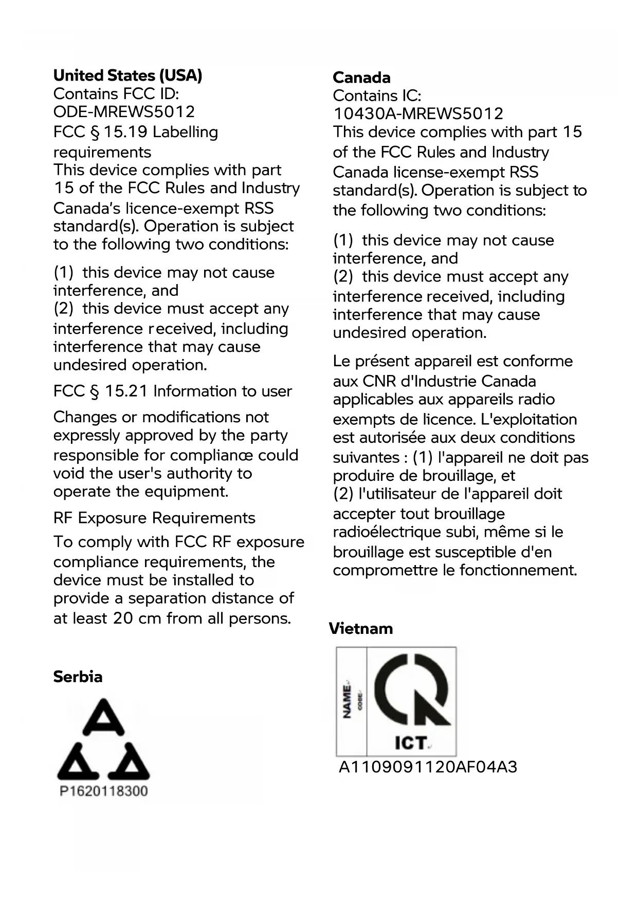 This device complies with part 15 of the FCC Rules and Industry Canada license-exempt RSS standard(s). Operation is subject to the following two conditions: