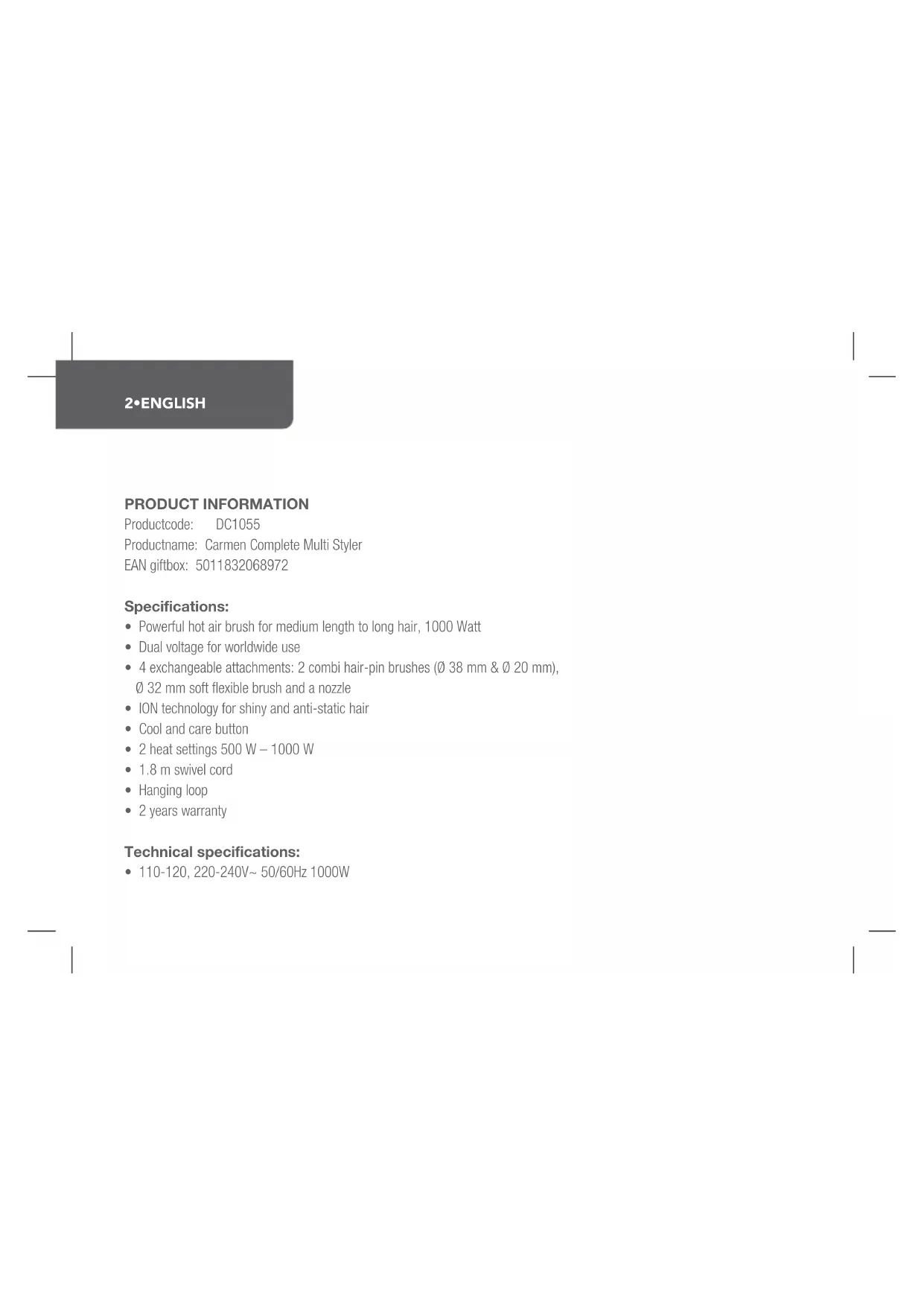 - Expired warranty. This device conforms to the Electromagnetic Compatibility Directive 2014/30/EU and the Low Voltage Directive 2014/35/EU This is a class II device with double insulation and no grounding For warranty and service we refer you to the reseller and for more information you can consult our website www.carmen.nl.PRODUCTINFORMATIE Productcode: DC1055 Productnaam: Carmen Complete Multi Styler EAN geschenkverpakking: 5011832068972 Specificaties: