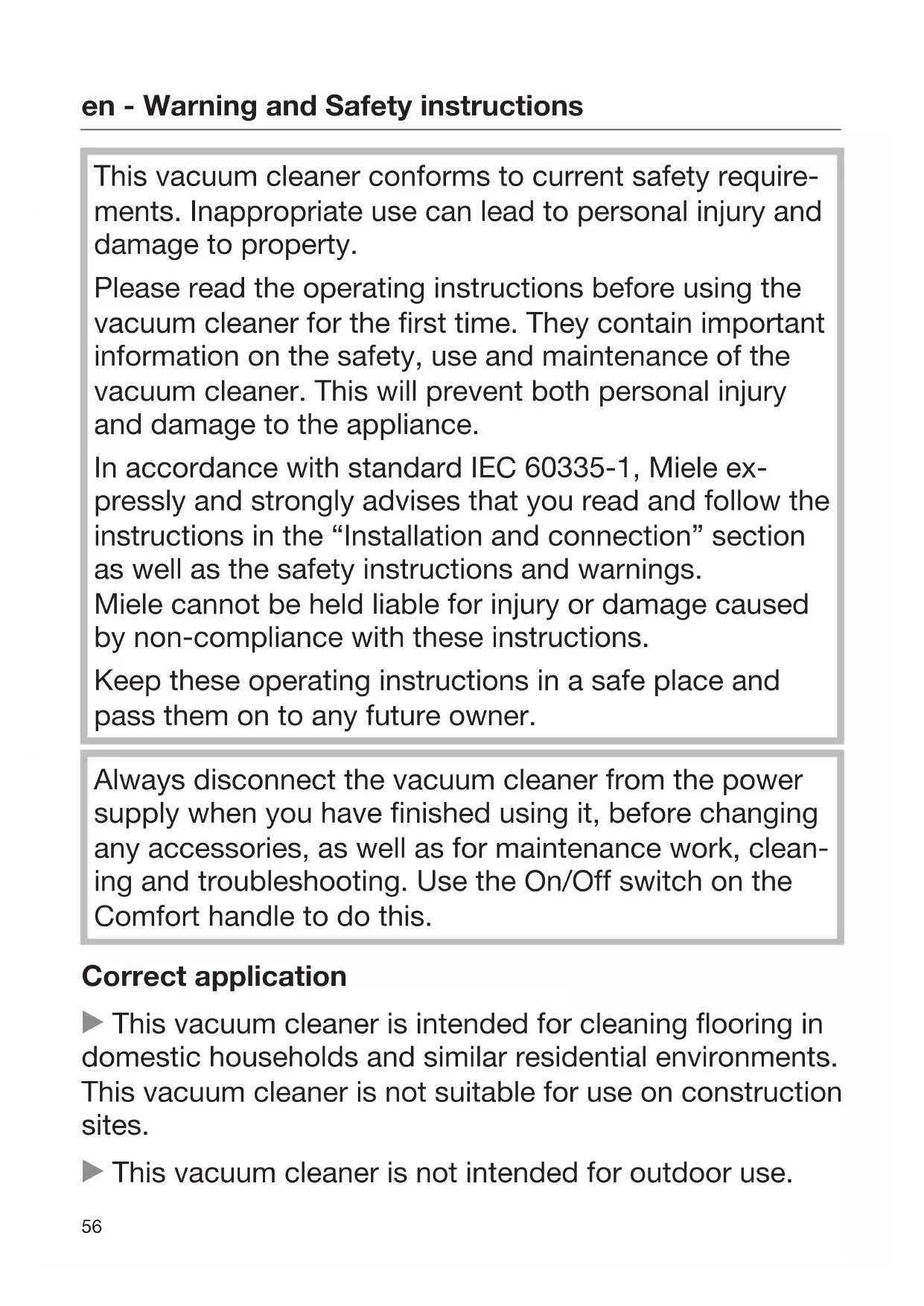 This vacuum cleaner conforms to current safety require- ments. Inappropriate use can lead to personal injury and damage to property. Please read the operating instructions before using the vacuum cleaner for the first time. They contain important information on the safety, use and maintenance of the vacuum cleaner. This will prevent both personal injury and damage to the appliance. In accordance with standard IEC60335-1, Miele ex- pressly and strongly advises that you read and follow the instructions in the “Installation and connection” section as well as the safety instructions and warnings. Miele cannot be held liable for injury or damage caused by non-compliance with these instructions. Keep these operating instructions in a safe place and pass them on to any future owner. Always disconnect the vacuum cleaner from the power supply when you have finished using it, before changing any accessories, as well as for maintenance work, clean- ing and troubleshooting. Use the On/Off switch on the Comforthandle to do this. Correct application This vacuum cleaner is intended for cleaning flooring in domestic households and similar residential environments. This vacuum cleaner is not suitable for use on construction sites. This vacuum cleaner is not intended for outdoor use.en - Warning and Safety instructions
