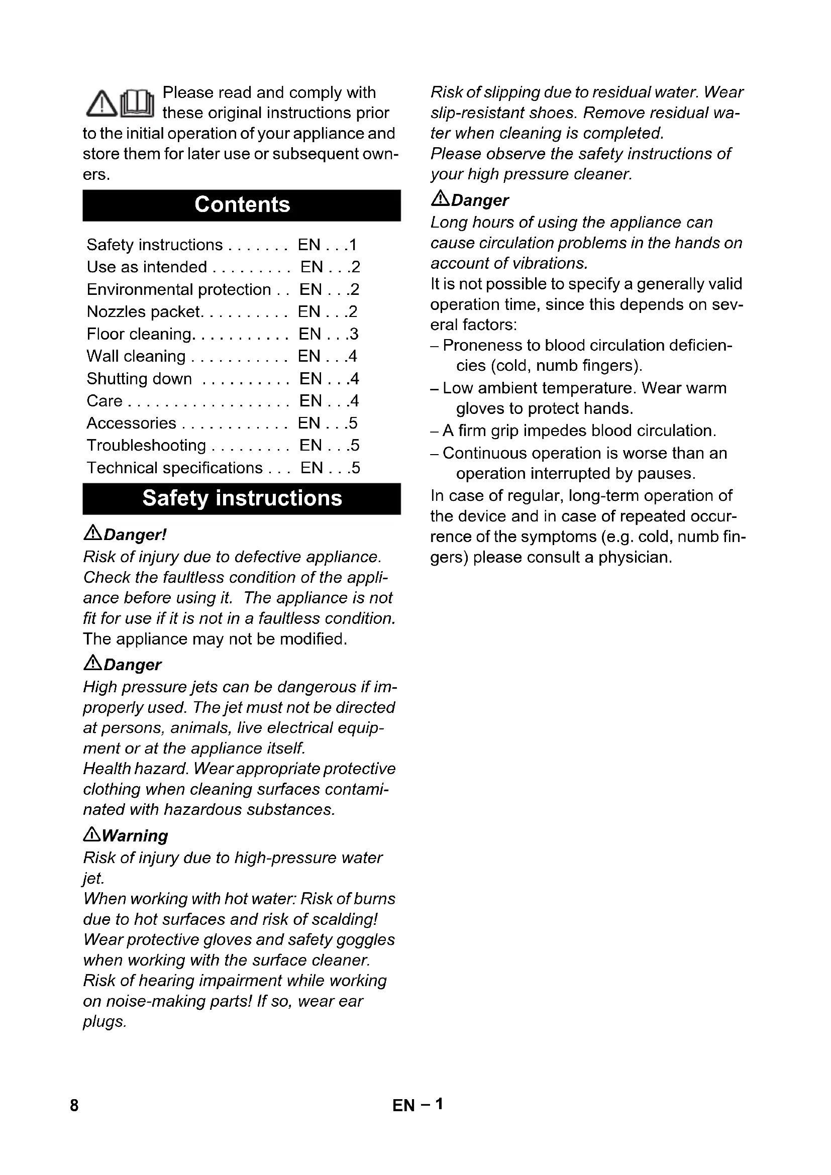 • 0,4 7DE– 1 Please read and comply with these original instructions prior to the initial operation of your appliance and store them for later use or subsequent own- ers. Danger! Risk of injury due to defective appliance. Check the faultless condition of the appli- ance before using it. The appliance is not fit for use if it is not in a faultless condition. The appliance may not be modified. Danger High pressure jets can be dangerous if im- properly used. The jet must not be directed at persons, animals, live electrical equip- ment or at the appliance itself. Health hazard. Wear appropriate protective clothing when cleaning surfaces contami- nated with hazardous substances. 몇 Warning Risk of injury due to high-pressure water jet. When working with hot water: Risk of burns due to hot surfaces and risk of scalding! Wear protective gloves and safety goggles when working with the surface cleaner. Risk of hearing impairment while working on noise-making parts! If so, wear ear plugs. Risk of slipping due to residual water. Wear slip-resistant shoes. Remove residual wa- ter when cleaning is completed. Please observe the safety instructions of your high pressure cleaner. Danger Long hours of using the appliance can cause circulation problems in the hands on account of vibrations. It is not possible to specify a generally valid operation time, since this depends on sev- eral factors: – Proneness to blood circulation deficien- cies (cold, numb fingers). – Low ambient temperature. Wear warm gloves to protect hands. – A firm grip impedes blood circulation. – Continuous operation is worse than an operation interrupted by pauses. In case of regular, long-term operation of the device and in case of repeated occur- rence of the symptoms (e.g. cold, numb fin- gers) please consult a physician. Contents Safety instructions
