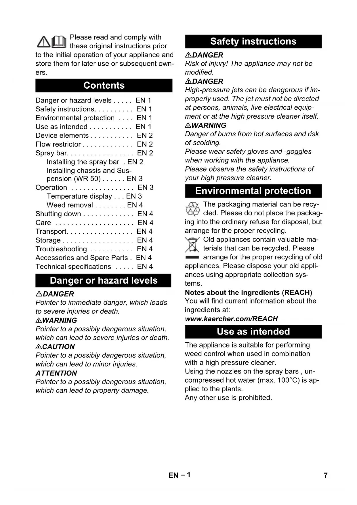 HDS 1000 De 2.113-071.0 HDS 1000 Be 2.113-071.0 HDS 13/20 DeTr.1 2.113-026.0 HDS 17/20 DeTr.1 2.113-026.0 Spray bar Installing the spray bar 8 EN– 3 Note The openings of the spray bar must face downwards not forwards. Note If necessary, the WR 50 can be used with the chassis and suspension. Insert spray bar into the chassis and suspension support. Note On the support, adjust the clearance be- tween the spray bar and the surface (ap- prox. 50 mm - 100 mm above the surface). Loosen the star handle screw. Move the spray bar in the holder. Tighten star handle screw. 몇 WARNING Risk of burns! The spray bar must be in- stalled in such a way that the outlet open- ings face downwards. Do not direct the water jet on persons or an- imals. Do not touch WR 20/ WR 50 / WR 100 or reach into the water stream during opera- tion. Set the device switch on the high-pres- sure cleaner to max. 98 °C. If installed, set the Servo Control to the max. setting. Note Depending on the high-pressure cleaner in use, the heating-up time can last between 2 and 5 minutes. The temperature indicator provides infor- mation on when the required water temper- ature has been reached. Switch on the high pressure cleaner and pull the lever of the high pressure gun. Wait until hot water emerges from the spray bar. The temperature indicator changes with the increasing water temperature. The colour of the indicator fields chang- es from left to right from black to brown. When the bar is coloured completely green at the right, the device is ready for operation. Installing chassis and Suspension (WR 50) Operation Temperature display 9EN– 4 Guide the spray bar slowly over the weed. Repeat the procedure several times if required. Note The optimal effect has been achieved when the hot water flows with almost no pressure and a light steam formation. 몇 WARNING Risk of burns! Allow WR20 / WR 50 / WR 100 to cool before removal. After the operation, operate the spray bar with cold water for two minutes in order to cool it down. If necessary, rinse the spray bars and chassis and suspension (WR 50 / WR