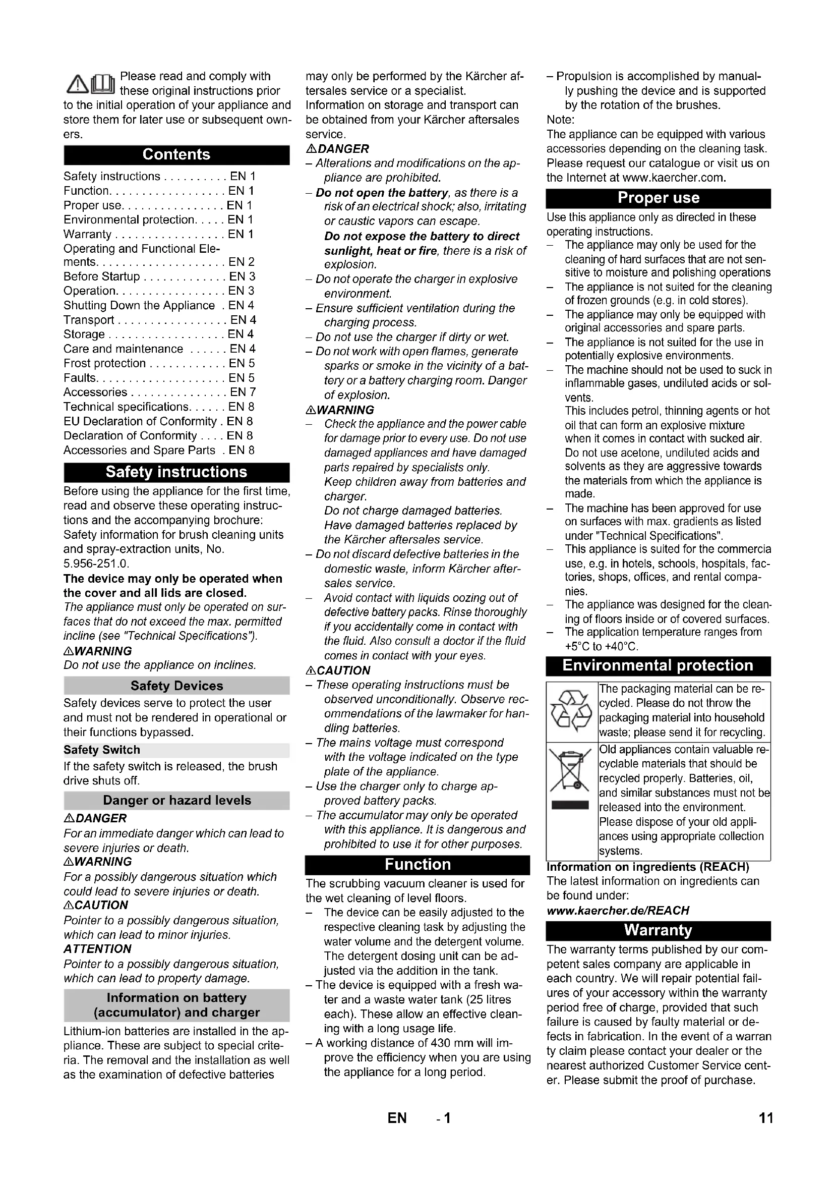 Zubehör und Ersatzteile Chairman of the Board of Management Director Regulatory Affairs & Certification 10 DE- 1 Please read and comply with these original instructions prior to the initial operation of your appliance and store them for later use or subsequent own- ers. Before using the appliance for the first time, read and observe these operating instruc- tions and the accompanying brochure: Safety information for brush cleaning units and spray-extraction units, No. 5.956-251.0. The device may only be operated when the cover and all lids are closed. The appliance must only be operated on sur- faces that do not exceed the max. permitted incline (see "Technical Specifications"). 몇 WARNING Do not use the appliance on inclines. Safety devices serve to protect the user and must not be rendered in operational or their functions bypassed. If the safety switch is released, the brush drive shuts off. DANGER For an immediate danger which can lead to severe injuries or death. 몇 WARNING For a possibly dangerous situation which could lead to severe injuries or death. 몇 CAUTION Pointer to a possibly dangerous situation, which can lead to minor injuries. ATTENTION Pointer to a possibly dangerous situation, which can lead to property damage. Lithium-ion batteries are installed in the ap- pliance. These are subject to special crite- ria. The removal and the installation as well as the examination of defective batteries may only be performed by the Kärcher af- tersales service or a specialist. Information on storage and transport can be obtained from your Kärcher aftersales service. DANGER – Alterations and modifications on the ap- pliance are prohibited. – Do not open the battery, as there is a risk of an electrical shock; also, irritating or caustic vapors can escape. Do not expose the battery to direct sunlight, heat or fire, there is a risk of explosion. – Do not operate the charger in explosive environment. – Ensure sufficient ventilation during the charging process. – Do not use the charger if dirty or wet. – Do not work with open flames, generate sparks or smoke in the vicinity of a bat- tery or a battery charging room. Danger of explosion. 몇 WARNING