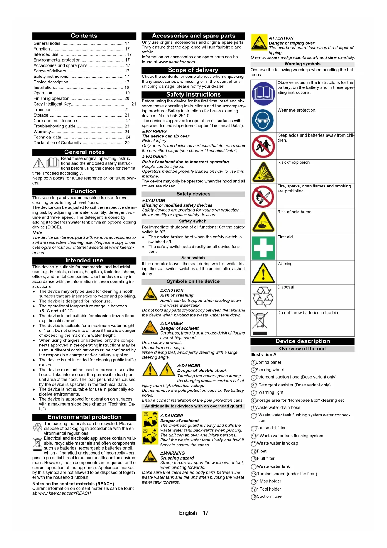 - ) - - 2943 (30) 2943 (30) - R 75 D 75 R 85 D 90 D 110English 17 Contents General notes Read these original operating instruc- tions and the enclosed safety instruc- tions before using the device for the first time. Proceed accordingly. Keep both books for future reference or for future own- ers. Function This scouring and vacuum machine is used for wet cleaning or polishing of level floors. The device can be adjusted to suit the respective clean- ing task by adjusting the water quantity, detergent vol- ume and travel speed. The detergent is dosed by adding it to the fresh water tank or via an optional dosing device (DOSE). Note The device can be equipped with various accessories to suit the respective cleaning task. Request a copy of our catalogue or visit our Internet website at www.kaerch- er.com. Intended use This device is suitable for commercial and industrial use, e.g. in hotels, schools, hospitals, factories, shops, offices, and rental companies. Use the device only in accordance with the information in these operating in- structions. ● The device may only be used for cleaning smooth surfaces that are insensitive to water and polishing. ● The device is designed for indoor use. ● The operational temperature range is between +5 °C and +40 °C. ● The device is not suitable for cleaning frozen floors (e.g. in cold stores). ● The device is suitable for a maximum water height of 1 cm. Do not drive into an area if there is a danger of exceeding the maximum water height. ● When using chargers or batteries, only the compo- nents approved in the operating instructions may be used. A different combination must be confirmed by the responsible charger and/or battery supplier. ● The device is not intended for cleaning public traffic routes. ● The device must not be used on pressure-sensitive floors. Take into account the permissible load per unit area of the floor. The load per unit area caused by the device is specified in the technical data. ● The device is not suitable for use in potentially ex- plosive environments. ● The device is approved for operation on surfaces with a maximum slope (see chapter "Technical Da- ta"). Environmental protection The packing materials can be recycled. Please dispose of packaging in accordance with the en- vironmental regulations. Electrical and electronic appliances contain valu- able, recyclable materials and often components such as batteries, rechargeable batteries or oil, which - if handled or disposed of incorrectly - can pose a potential threat to human health and the environ- ment. However, these components are required for the correct operation of the appliance. Appliances marked by this symbol are not allowed to be disposed of togeth- er with the household rubbish. Notes on the content materials (REACH) Current information on content materials can be found at: www.kaercher.com/REACH Accessories and spare parts Only use original accessories and original spare parts. They ensure that the appliance will run fault-free and safely. Information on accessories and spare parts can be found at www.kaercher.com. Scope of delivery Check the contents for completeness when unpacking. If any accessories are missing or in the event of any shipping damage, please notify your dealer. Safety instructions Before using the device for the first time, read and ob- serve these operating instructions and the accompany- ing brochure: Safety instructions for brush cleaning devices, No. 5.956-251.0. The device is approved for operation on surfaces with a specified limited slope (see chapter "Technical Data"). 몇 WARNING The device can tip over Risk of injury Only operate the device on surfaces that do not exceed the permitted slope (see chapter "Technical Data"). 몇 WARNING Risk of accident due to incorrect operation People can be injured. Operators must be properly trained on how to use this machine. The device may only be operated when the hood and all covers are closed. Safety devices 몇 CAUTION Missing or modified safety devices Safety devices are provided for your own protection. Never modify or bypass safety devices. Safety switch For immediate shutdown of all functions: Set the safety switch to "0". ● The device brakes hard when the safety switch is switched off. ● The safety switch acts directly on all device func- tions Seat switch If the operator leaves the seat during work or while driv- ing, the seat switch switches off the engine after a short delay. Symbols on the device 몇CAUTION Risk of crushing Hands can be trapped when pivoting down the waste water tank. Do not hold any parts of your body between the tank and the device when pivoting the waste water tank down. DANGER Danger of accident On slopes, there is an increased risk of tipping over at high speed. Drive slowly downhill. Do not turn on a slope. When driving fast, avoid jerky steering with a large steering angle. DANGER Danger of electric shock Touching the battery poles during the charging process carries a risk of injury from high electrical voltage. Do not remove the pole protection caps on the battery poles. Ensure correct installation of the pole protection caps. Additionally for devices with an overhead guard DANGER Danger of accident The overhead guard is heavy and pulls the waste water tank backwards when pivoting. The unit can tip over and injure persons. Pivot the waste water tank slowly and hold it firmly to control the speed. 몇WARNING Crushing hazard Strong forces act upon the waste water tank when pivoting forwards. Make sure that there are no body parts between the waste water tank and the unit when pivoting the waste water tank forwards. ATTENTION Danger of tipping over The overhead guard increases the danger of tipping. Drive on slopes and gradients slowly and steer carefully. Warning symbols Observe the following warnings when handling the bat- teries: Device description Overview of the unit Illustration A 1 Control panel 2 Steering wheel 3 Detergent sucti