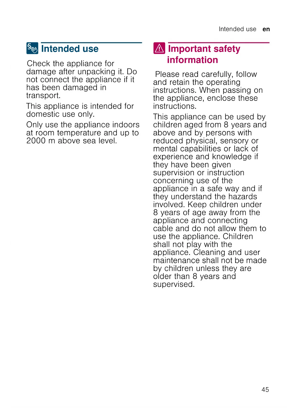 This appliance can be used by children aged from 8 years and above and by persons with reduced physical, sensory or mental capabilities or lack of experience and knowledge if they have been given supervision or instruction concerning use of the appliance in a safe way and if they understand the hazards involved. Keep children under 8 years of age away from the appliance and connecting cable and do not allow them to use the appliance. Children shall not play with the appliance. Cleaning and user maintenance shall not be made by children unless they are older than 8 years and supervised.