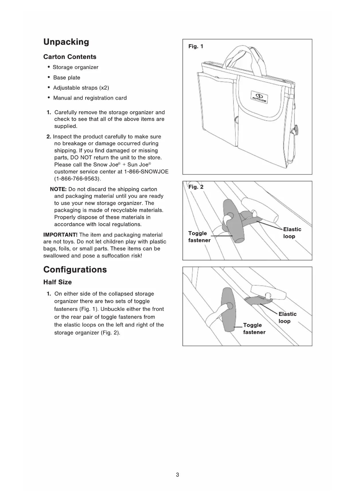 customer service center at 1-866-SNOWJOE (1-866-766-9563). NOTE: Do not discard the shipping carton and packaging material until you are ready to use your new storage organizer. The packaging is made of recyclable materials. Properly dispose of these materials in accordance with local regulations. IMPORTANT! The item and packaging material are not toys. Do not let children play with plastic bags, foils, or small parts. These items can be swallowed and pose a suffocation risk! Configurations Half Size