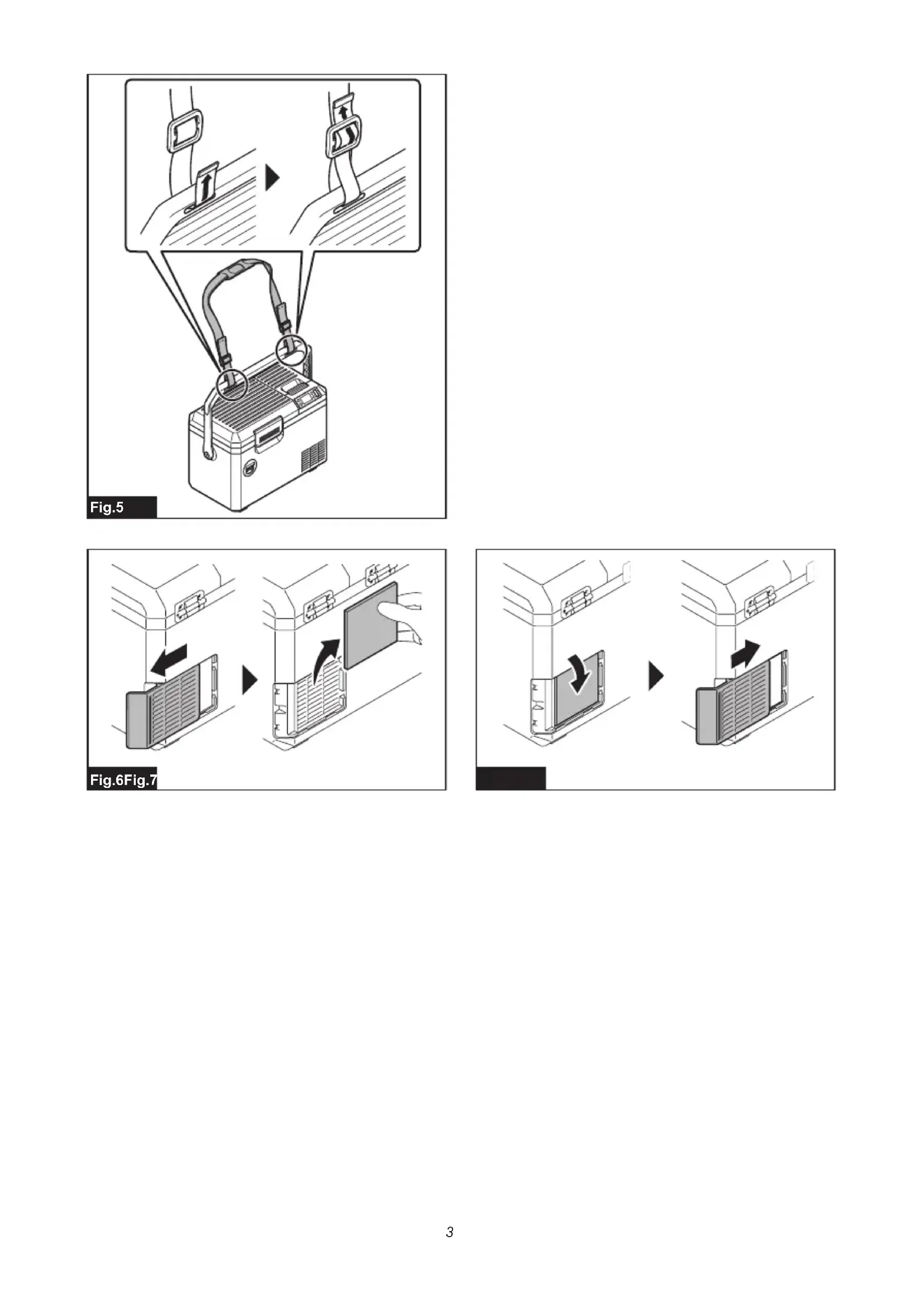 it for a long period (more than six months).9 ENGLISH CAUTION: Always install the battery cartridge fully until the red indicator cannot be seen. If not, it may accidentally fall out of the appliance, causing injury to you or someone around you. CAUTION: Do not install the battery cartridge forcibly. If the cartridge does not slide in easily, it is not being inserted correctly. B) AC adapter (Only use for recreational vehicle) Optional accessory When using the appliance with AC power, use the AC adapter supplied with the appliance. Insert the plug to “DC IN” inlet of the appliance and then insert the other end to an outlet. When the appliance is operating with power from AC adapter, the lamp of “DC IN” lights up. C) Cigarette lighter adapter When using the appliance with the cigarette lighter socket, use the cigarette lighter adapter supplied with the appliance. Insert the plug to “DC IN” inlet of the appliance and then insert the other end to the cigarette lighter socket. When the appliance is operating with power from cigarette lighter adapter, the lamp of “DC IN” lights up. CAUTION: Insert the plug completely into the “DC IN” inlet. Failure to do so may deform the plug or cause a fire. CAUTION: Always close the “DC IN” socket cover firmly when the power cord is not plugged. Otherwise foreign matter may enter the appliance and cause a malfunction. NOTE: When the appliance shifts power supply, the compressor will stop for about 3 minutes to protect the compressor. NOTE: After turning off the appliance, it takes about 3 minutes to restart the compressor because of the pro- tection of the compressor. NOTE: If the appliance stops by any means other than pressing the power button, the appliance turns on automatically when the power supply of the AC adapter or the cigarette lighter adapter is regained. PARTS DESCRIPTION ► Fig.1 1 Control panel 2 Battery cover 3 LED light 4 Upper cover 5 Upper cover hook 6 Opener 7 Carrying handle 8 "DC IN" socket 9 Filter cover 10 USB power supply port 11 Power button 12 Cool / heat switch button 13 Temperature display 14 Battery indicator 15 Temperature reduction button 16 Temperature plus button 17 Lamp of "DC IN" 18 Unit of temperature 19 Lamp of heating mode 20 Lamp of cooling mode OPERATION CAUTION: Do not put things that are easily perishable in the chamber. The food or drink may rot. NOTE: When operating the appliance in high humid environment, dew condensation may occur on the appliance. This is not malfunction of the appliance. Use a dry cloth to wipe the dew condensation off the appliance.