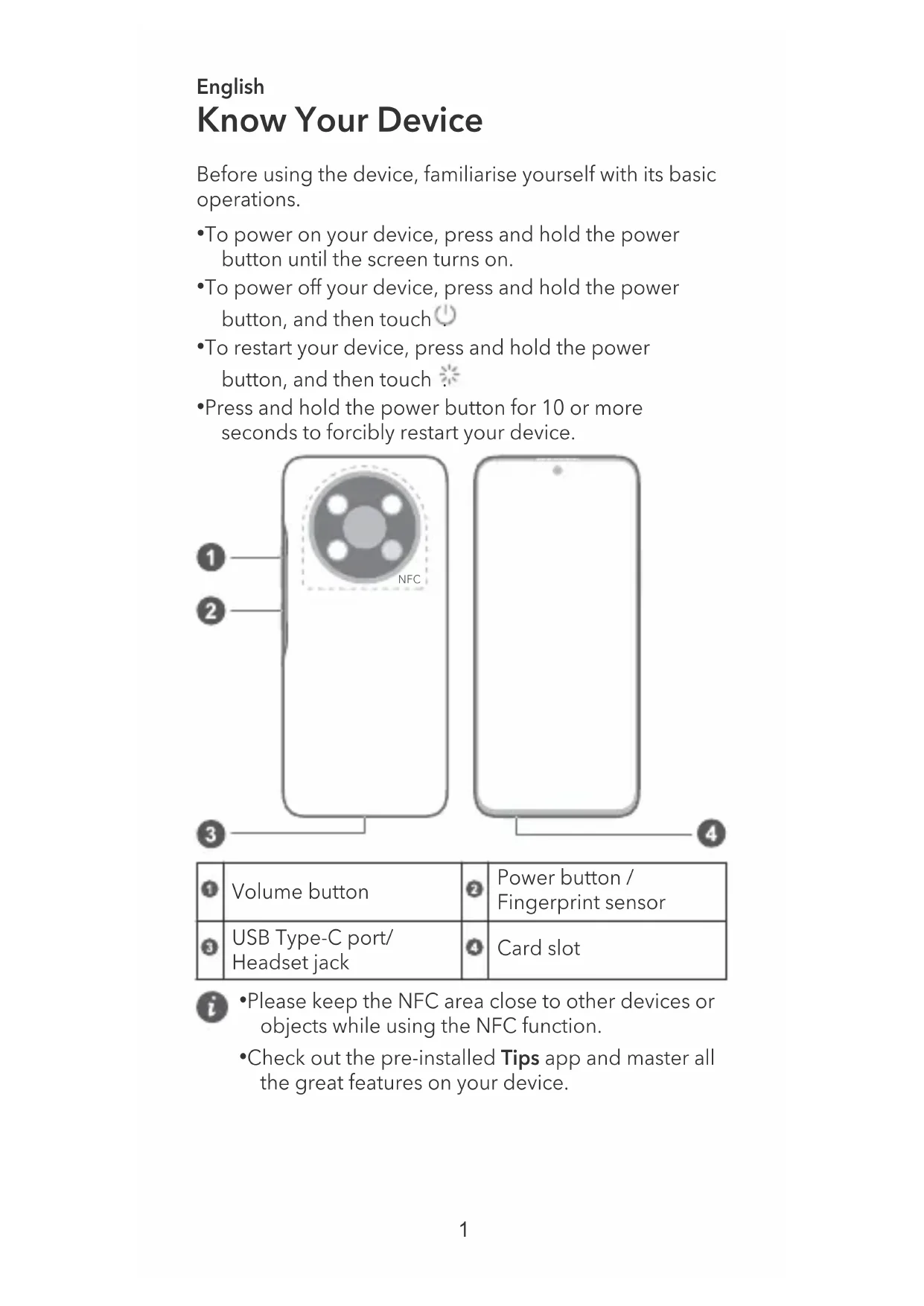 - Press and hold the power button for 10 or more seconds to forcibly restart your device. NFC Volume button Power button / Fingerprint sensor USB Type-C port/ Headset jack Card slot