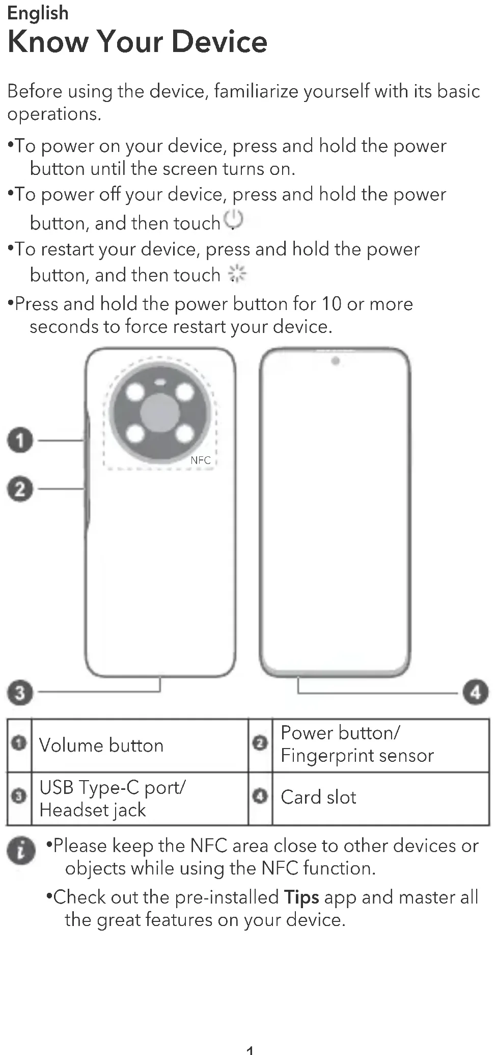 - Press and hold the power button for 10 or more seconds to force restart your device. NFC Volume button Power button/ Fingerprint sensor USB Type-C port/ Headset jack Card slot