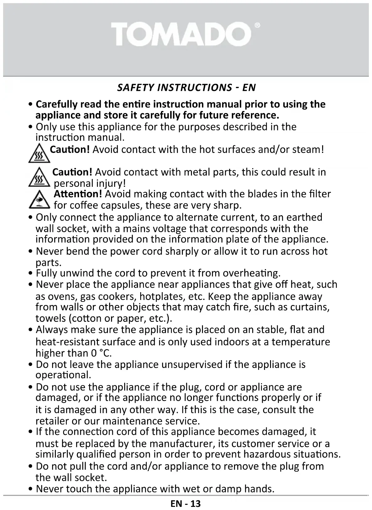 TPM1501B - Coffee machine Tomado - Free user manual and instructions