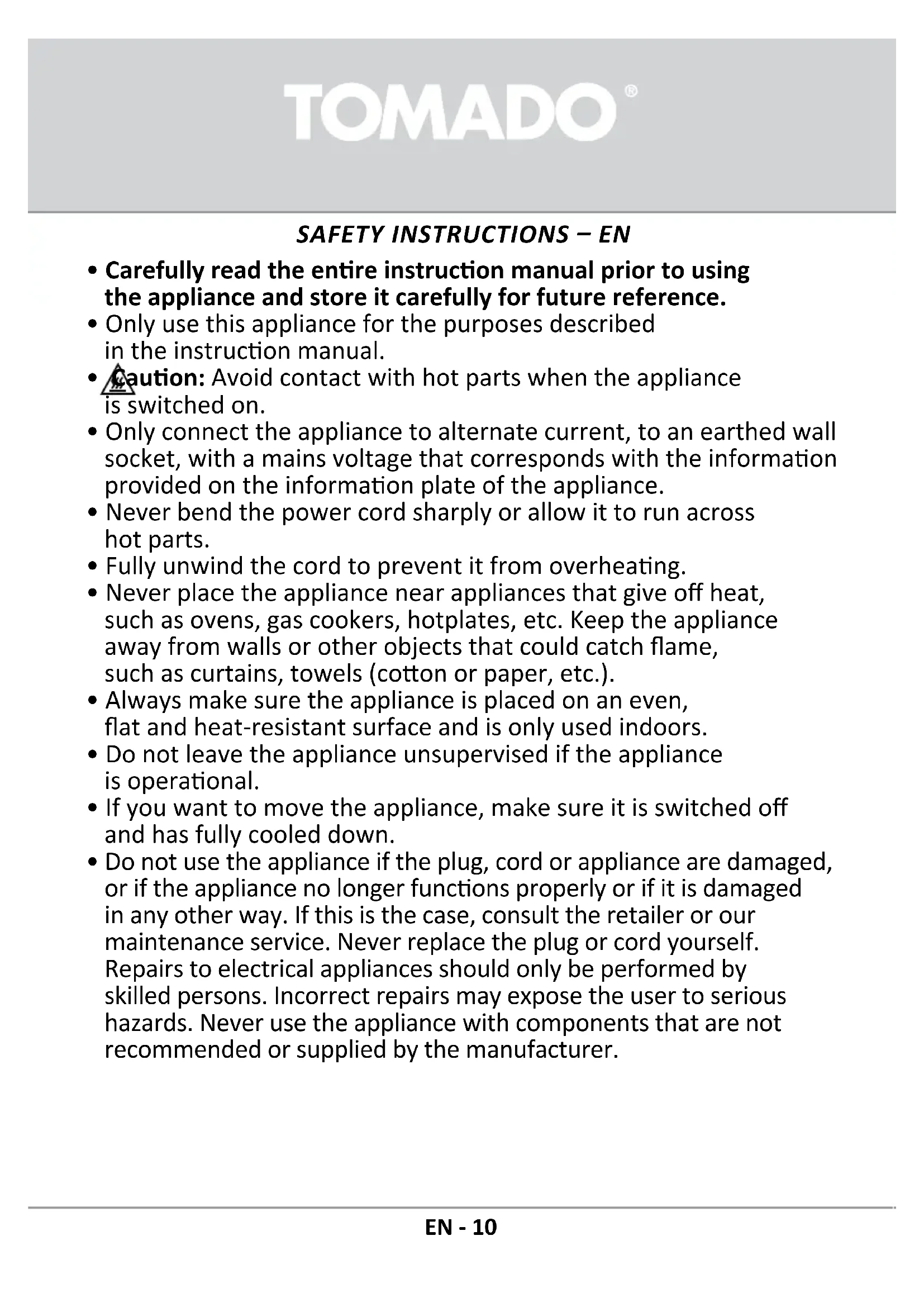 Go to www.tomado.com/support to purchase accessories or spare parts. ORDERING ACCESSORIES A 24 month warranty is provided for this product. Your warranty is valid if the product has been used in accordance with the user instrucons and for the purpose for which it was made. Also the original proof of purchase must be submied, stang the date of purchase, the name of the retailer and the item number of the product. For extensive warranty informaon you are referred to our website: www.tomado.com/support WARRANTY CONDITIONS