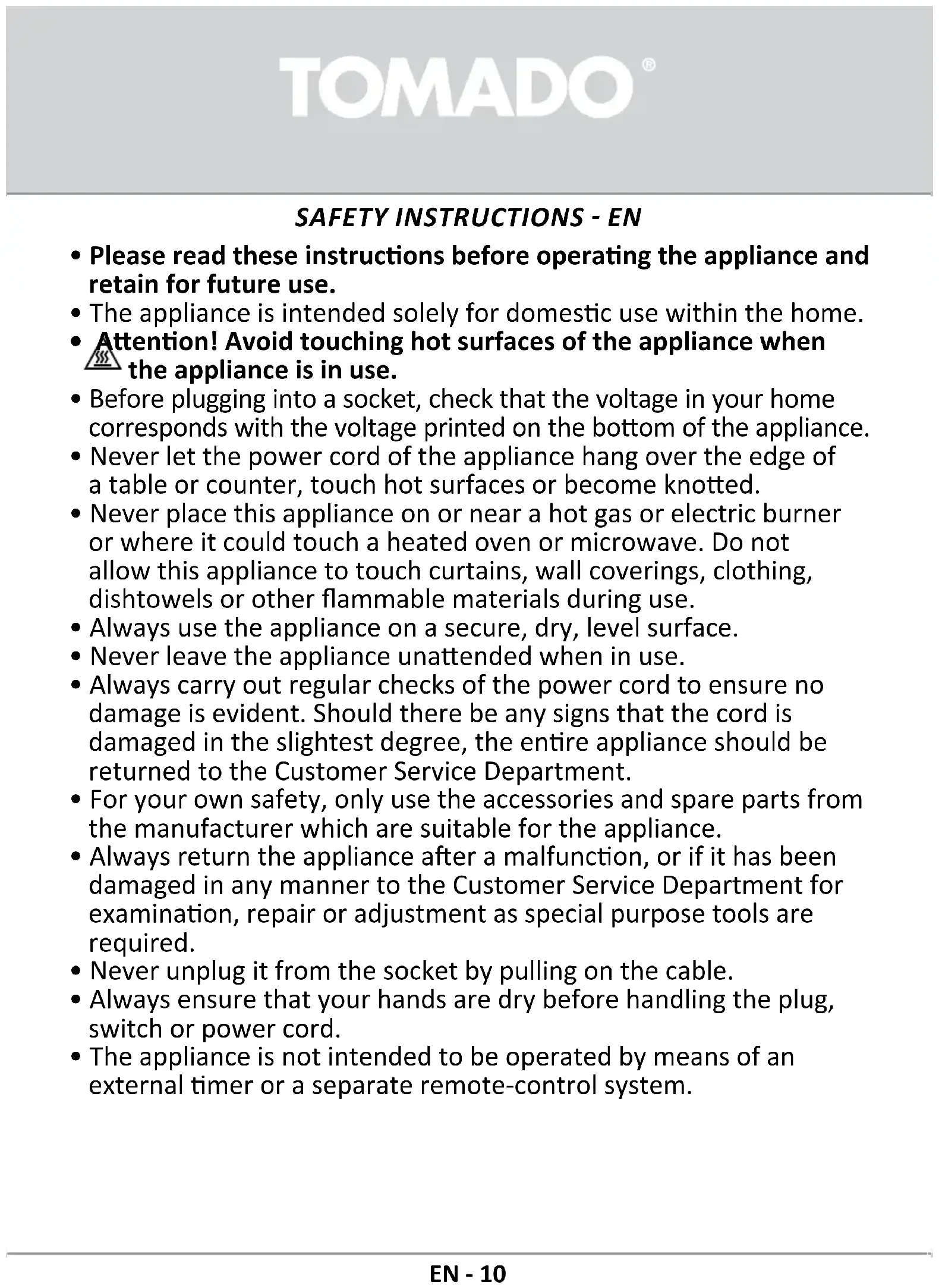 Go to www.tomado.com/support to purchase accessories or spare parts.